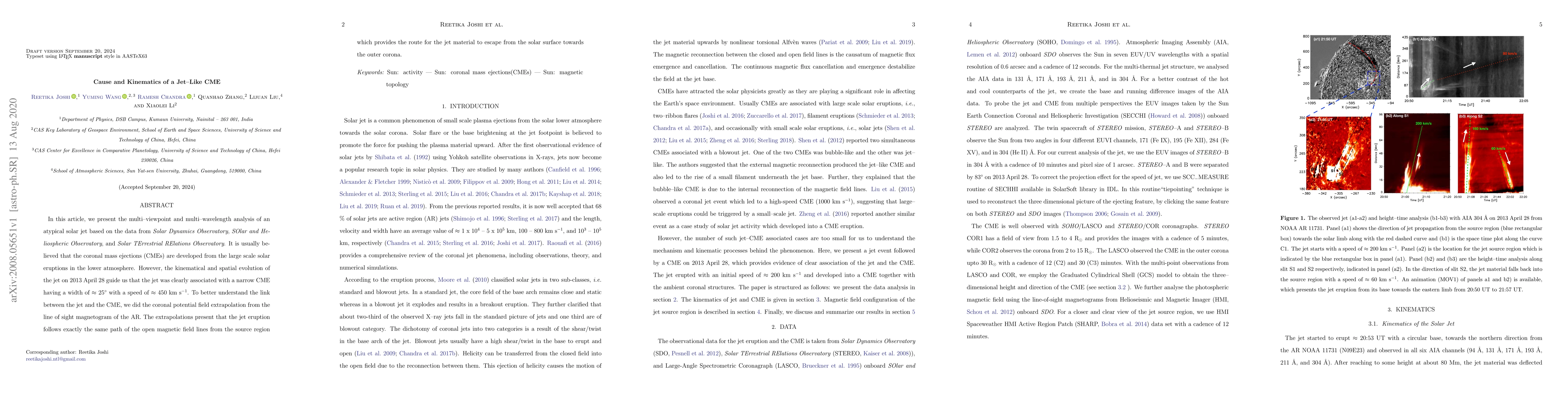 In this article, we present the multi-viewpoint and multi-wavelength analysis of an atypical solar jet based on the data from Solar Dynamics Observatory, SOlar, and Heliospheric Observatory, and Solar TErrestrial RElations Observatory. It is usually believed that the coronal mass ejections (CMEs) are developed from the large scale solar eruptions in the lower atmosphere. However, the kinematical and spatial evolution of the jet on 2013 April 28 guide us that the jet was clearly associated with a narrow CME having a width of approx 25 degrees with a speed of 450 km/s. To better understand the link between the jet and the CME, we did the coronal potential field extrapolation from the line of sight magnetogram of the AR. The extrapolations present that the jet eruption follows exactly the same path of the open magnetic field lines from the source region which provides the route for the jet material to escape from the solar surface towards the outer corona.
