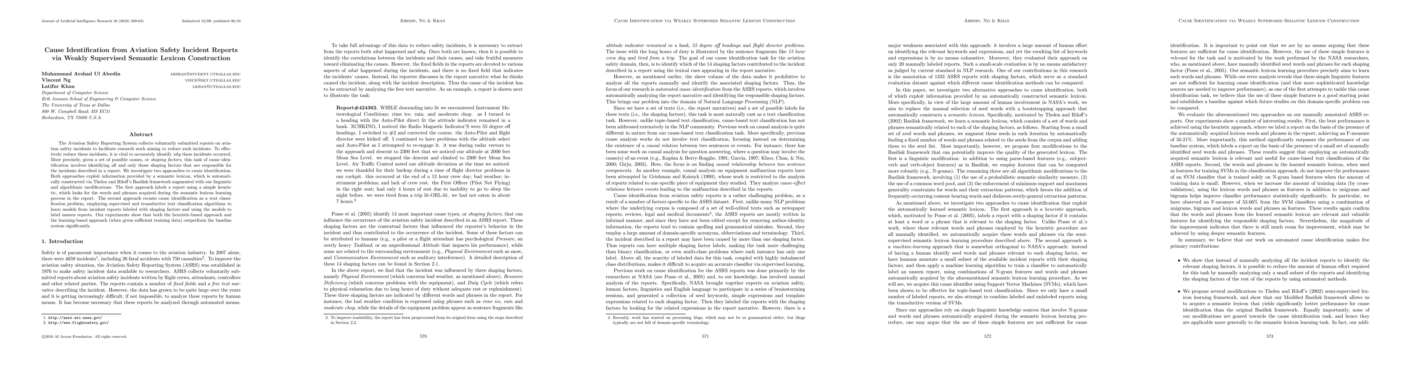 The Aviation Safety Reporting System collects voluntarily submitted reports on aviation safety incidents to facilitate research work aiming to reduce such incidents. To effectively reduce these incidents, it is vital to accurately identify why these incidents occurred. More precisely, given a set of possible causes, or shaping factors, this task of cause identification involves identifying all and only those shaping factors that are responsible for the incidents described in a report. We investigate two approaches to cause identification. Both approaches exploit information provided by a semantic lexicon, which is automatically constructed via Thelen and Riloffs Basilisk framework augmented with our linguistic and algorithmic modifications. The first approach labels a report using a simple heuristic, which looks for the words and phrases acquired during the semantic lexicon learning process in the report. The second approach recasts cause identification as a text classification problem, employing supervised and transductive text classification algorithms to learn models from incident reports labeled with shaping factors and using the models to label unseen reports. Our experiments show that both the heuristic-based approach and the learning-based approach (when given sufficient training data) outperform the baseline system significantly.