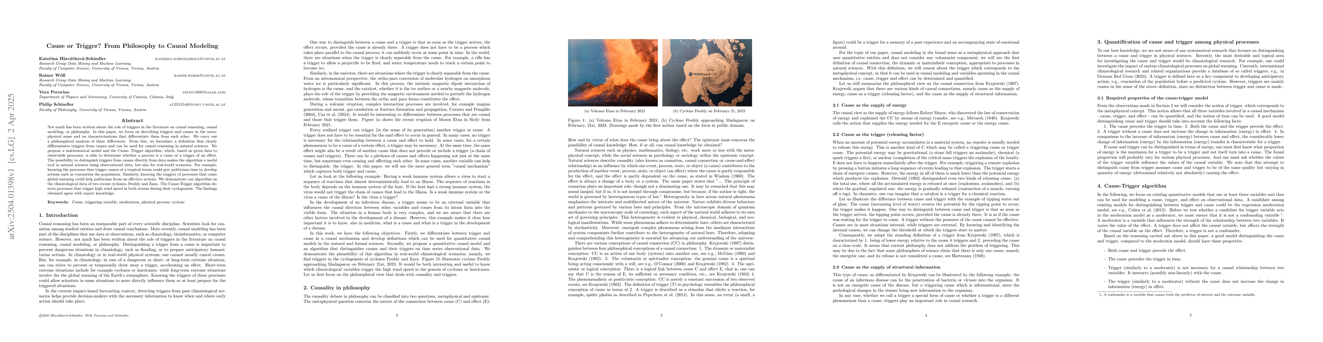 Not much has been written about the role of triggers in the literature on causal reasoning, causal modeling, or philosophy. In this paper, we focus on describing triggers and causes in the metaphysical sense and on characterizations that differentiate them from each other. We carry out a philosophical analysis of these differences. From this, we formulate a definition that clearly differentiates triggers from causes and can be used for causal reasoning in natural sciences. We propose a mathematical model and the Cause-Trigger algorithm, which, based on given data to observable processes, is able to determine whether a process is a cause or a trigger of an effect. The possibility to distinguish triggers from causes directly from data makes the algorithm a useful tool in natural sciences using observational data, but also for real-world scenarios. For example, knowing the processes that trigger causes of a tropical storm could give politicians time to develop actions such as evacuation the population. Similarly, knowing the triggers of processes that cause global warming could help politicians focus on effective actions. We demonstrate our algorithm on the climatological data of two recent cyclones, Freddy and Zazu. The Cause-Trigger algorithm detects processes that trigger high wind speed in both storms during their cyclogenesis. The findings obtained agree with expert knowledge.