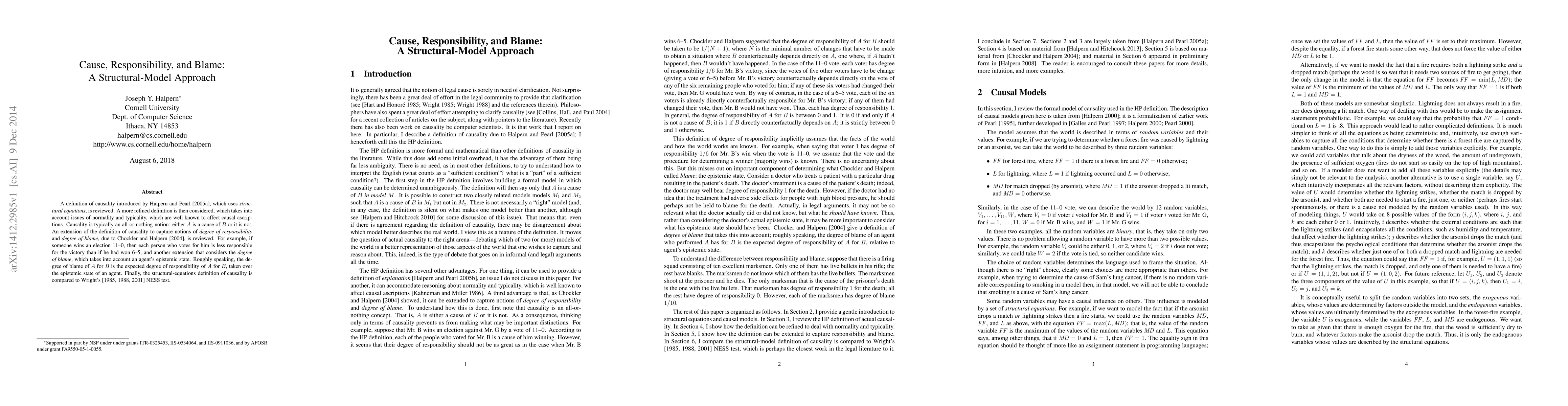 A definition of causality introduced by Halpern and Pearl, which uses structural equations, is reviewed. A more refined definition is then considered, which takes into account issues of normality and typicality, which are well known to affect causal ascriptions. Causality is typically an all-or-nothing notion: either A is a cause of B or it is not. An extension of the definition of causality to capture notions of degree of responsibility and degree of blame, due to Chockler and Halpern, is reviewed. For example, if someone wins an election 11-0, then each person who votes for him is less responsible for the victory than if he had won 6-5. Degree of blame takes into account an agent's epistemic state. Roughly speaking, the degree of blame of A for B is the expected degree of responsibility of A for B, taken over the epistemic state of an agent. Finally, the structural-equations definition of causality is compared to Wright's NESS test.