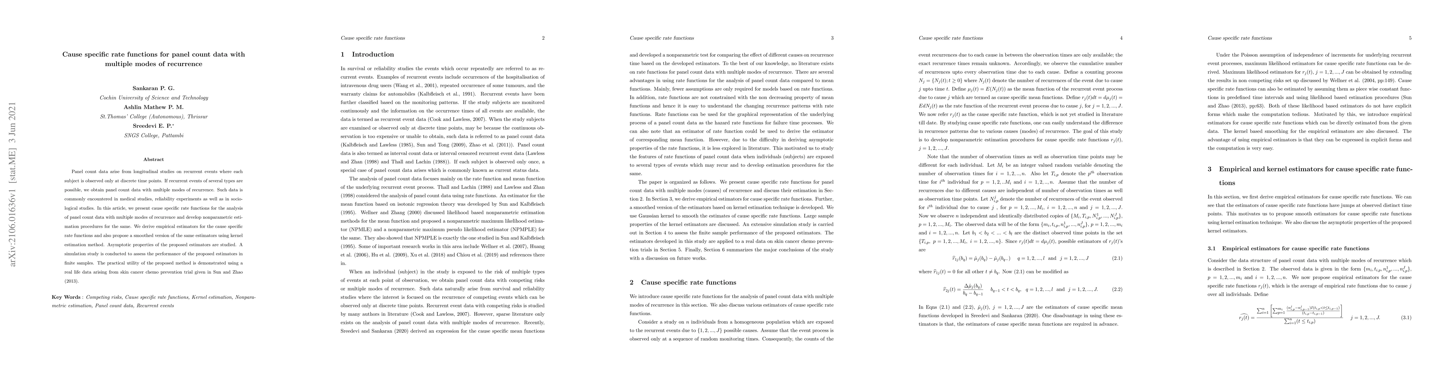 This paper develops cause specific rate functions and nonparametric estimation procedures for analyzing panel count data with multiple modes of recurrence, focusing on longitudinal studies with discrete observation points. It proposes empirical and smoothed kernel estimators, studies their asymptotic properties, and demonstrates their practical utility through simulations and a real-life skin cancer chemoprevention trial dataset.