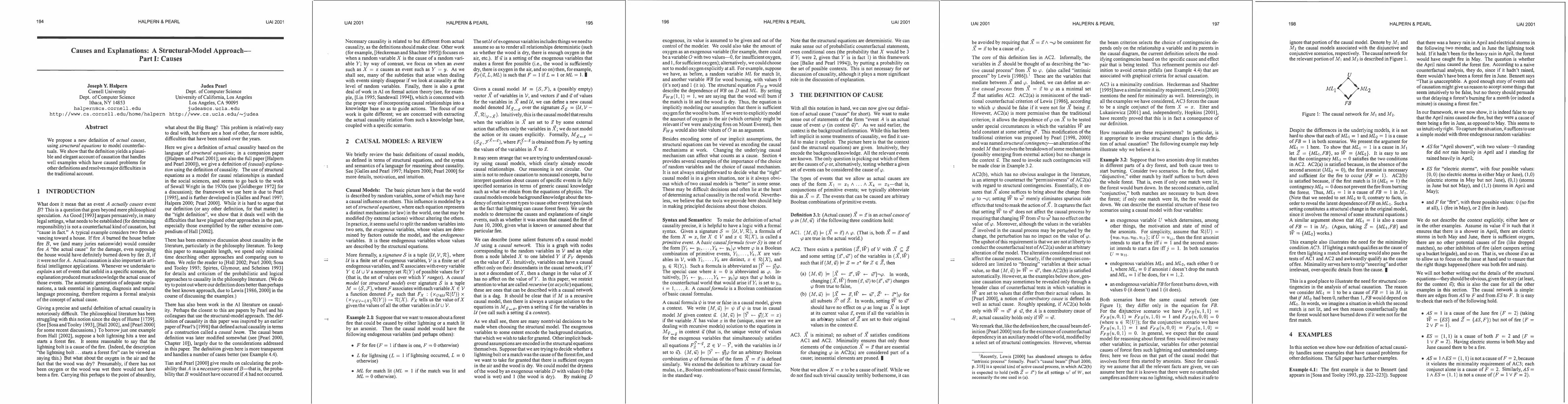 We propose a new definition of actual causes, using structural equations to model counterfactuals.We show that the definitions yield a plausible and elegant account ofcausation that handles well examples which have caused problems forother definitions and resolves major difficulties in the traditionalaccount. In a companion paper, we show how the definition of causality can beused to give an elegant definition of (causal) explanation.