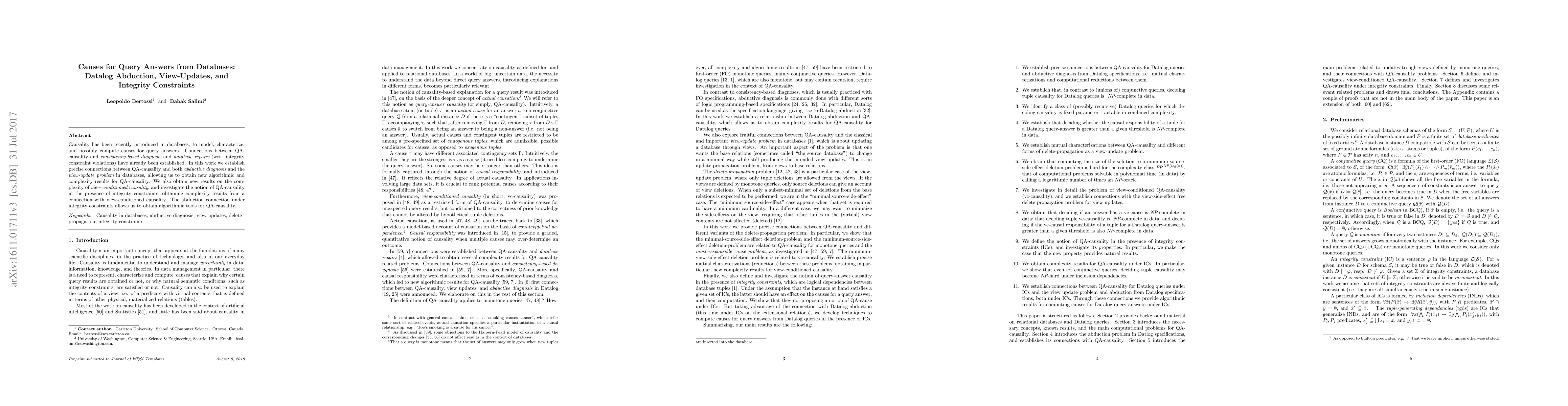 This paper explores the causality in databases to determine query answer causes, linking QA-causality with abductive diagnosis and the view-update problem. It establishes new algorithmic and complexity results for QA-causality, and investigates its interaction with integrity constraints, providing tools for database repairs.