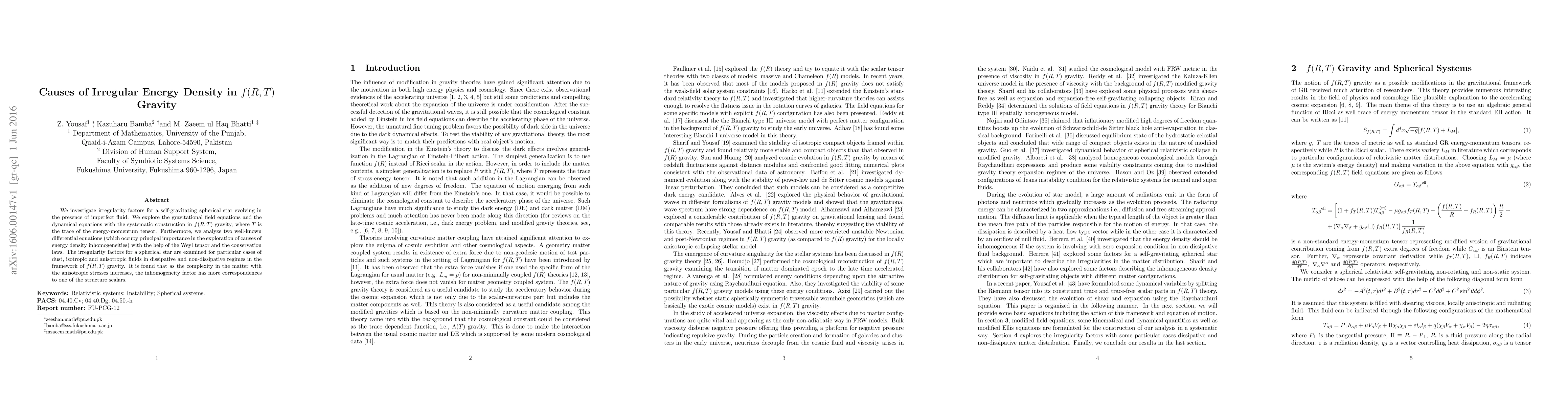 We investigate irregularity factors for a self-gravitating spherical star evolving in the presence of imperfect fluid. We explore the gravitational field equations and the dynamical equations with the systematic construction in $f(R,T)$ gravity, where $T$ is the trace of the energy-momentum tensor. Furthermore, we analyze two well-known differential equations (which occupy principal importance in the exploration of causes of energy density inhomogeneities) with the help of the Weyl tensor and the conservation laws. The irregularity factors for a spherical star are examined for particular cases of dust, isotropic and anisotropic fluids in dissipative and non-dissipative regimes in the framework of $f(R,T)$ gravity. It is found that as the complexity in the matter with the anisotropic stresses increases, the inhomogeneity factor has more correspondences to one of the structure scalars.