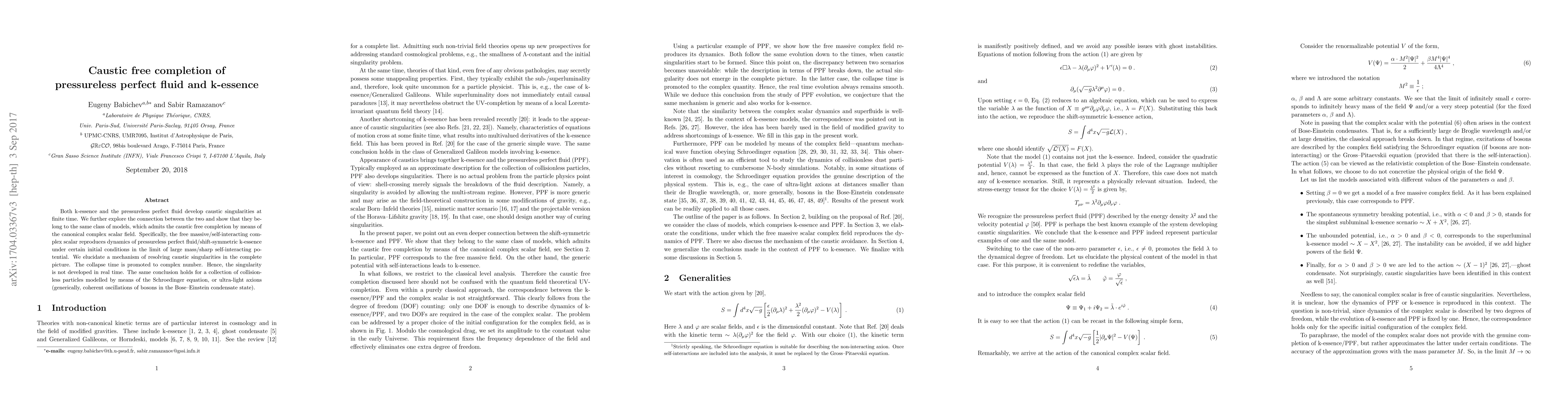 Both k-essence and the pressureless perfect fluid develop caustic singularities at finite time. We further explore the connection between the two and show that they belong to the same class of models, which admits the caustic free completion by means of the canonical complex scalar field. Specifically, the free massive/self-interacting complex scalar reproduces dynamics of pressureless perfect fluid/shift-symmetric k-essence under certain initial conditions in the limit of large mass/sharp self-interacting potential. We elucidate a mechanism of resolving caustic singularities in the complete picture. The collapse time is promoted to complex number. Hence, the singularity is not developed in real time. The same conclusion holds for a collection of collisionless particles modelled by means of the Schroedinger equation, or ultra-light axions (generically, coherent oscillations of bosons in the Bose--Einstein condensate state).