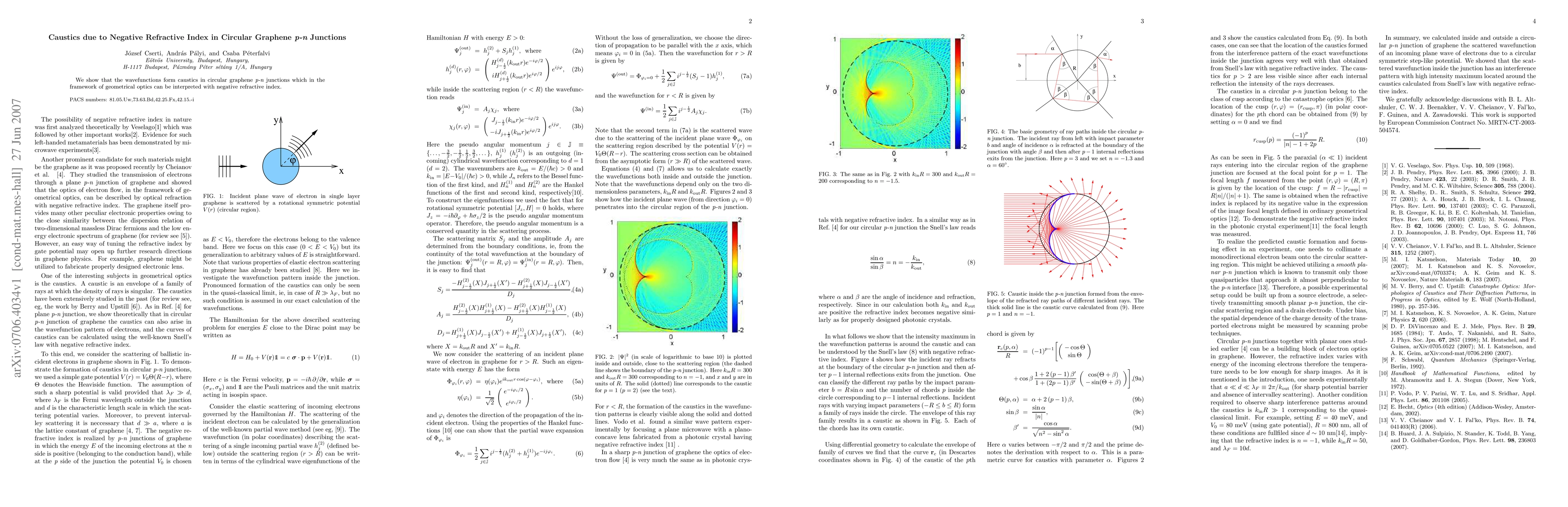 Summary: This study reveals that wavefunctions in circular graphene p-n junctions create caustics, which can be interpreted using the concept of negative refractive index in geometrical optics. This phenomenon highlights unique optical properties in graphene junctions.