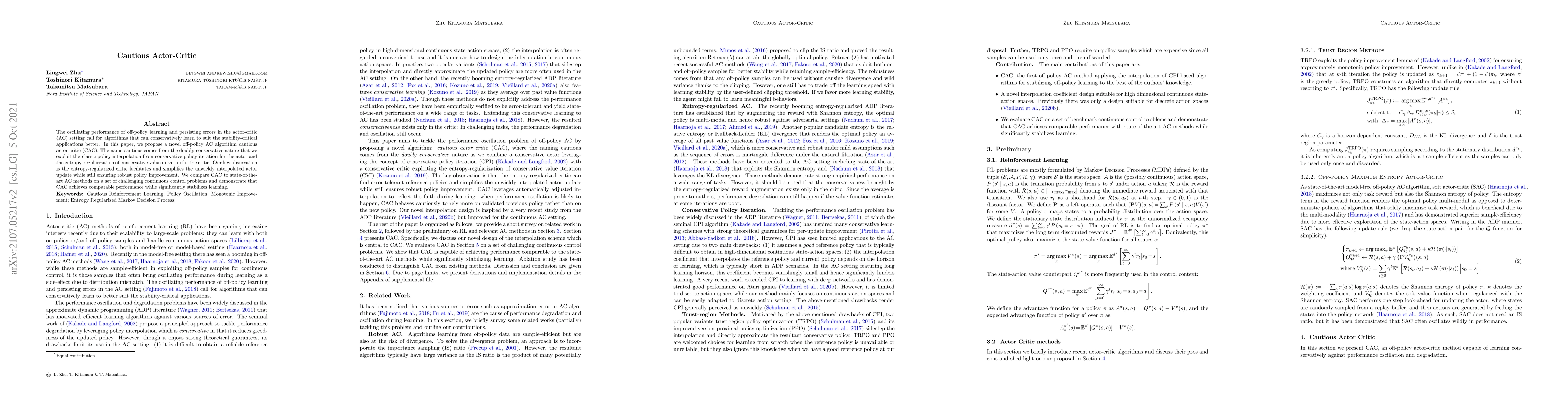 The paper proposes a novel cautious actor-critic (CAC) algorithm to stabilize off-policy learning in actor-critic settings, leveraging policy interpolation and entropy-regularized value iteration. CAC demonstrates comparable performance to state-of-the-art methods while significantly improving learning stability.