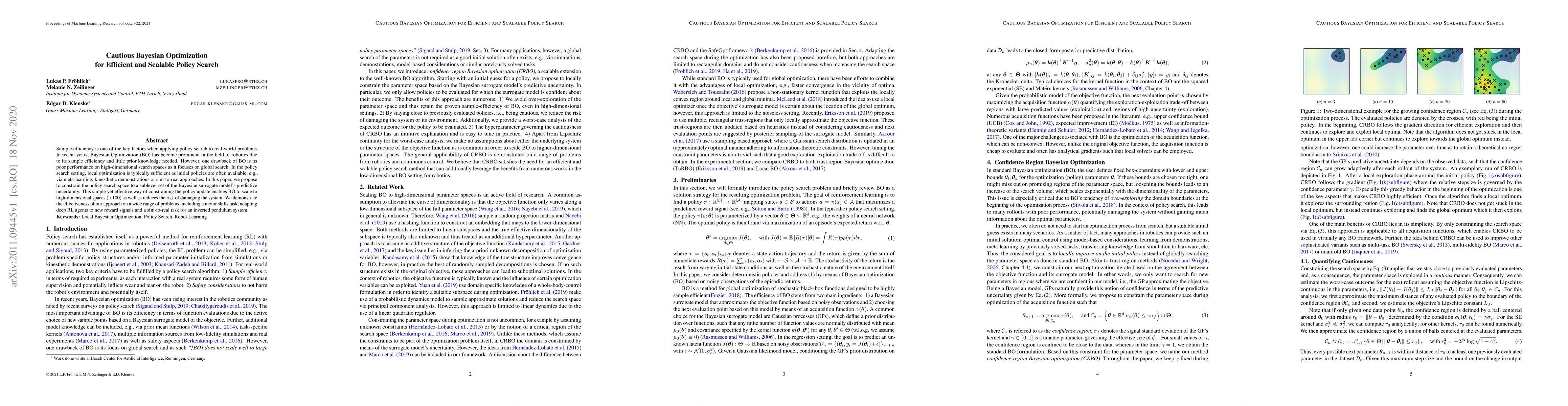 This paper proposes a cautious Bayesian Optimization method to enhance sample efficiency and scalability in policy search, particularly in high-dimensional spaces. It constrains the search space within the predictive uncertainty of the Bayesian surrogate model, enabling effective local optimization and demonstrating success across various tasks.