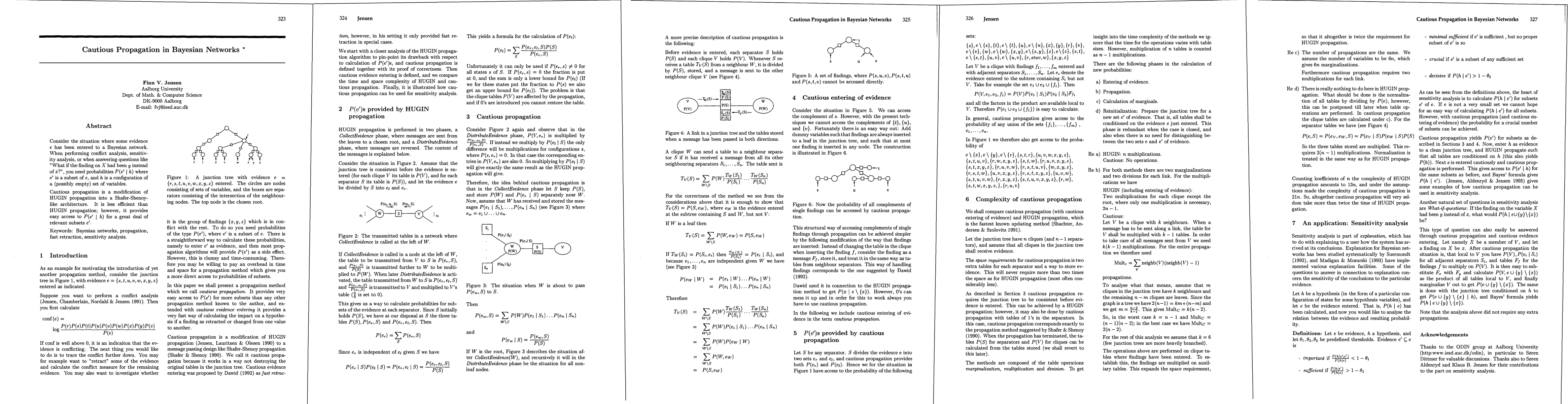 Consider the situation where some evidence e has been entered to a Bayesian network. When performing conflict analysis, sensitivity analysis, or when answering questions like "What if the finding on X had been y instead of x?" you need probabilities P (e'| h), where e' is a subset of e, and h is a configuration of a (possibly empty) set of variables. Cautious propagation is a modification of HUGIN propagation into a Shafer-Shenoy-like architecture. It is less efficient than HUGIN propagation; however, it provides easy access to P (e'| h) for a great deal of relevant subsets e'.