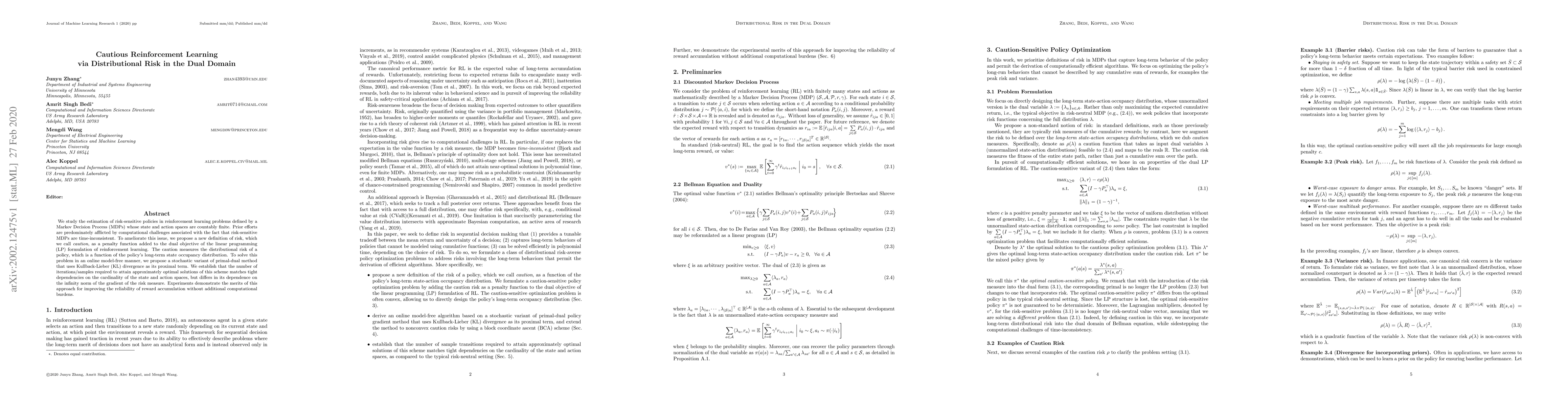 We study the estimation of risk-sensitive policies in reinforcement learning problems defined by a Markov Decision Process (MDPs) whose state and action spaces are countably finite. Prior efforts are predominately afflicted by computational challenges associated with the fact that risk-sensitive MDPs are time-inconsistent. To ameliorate this issue, we propose a new definition of risk, which we call caution, as a penalty function added to the dual objective of the linear programming (LP) formulation of reinforcement learning. The caution measures the distributional risk of a policy, which is a function of the policy's long-term state occupancy distribution. To solve this problem in an online model-free manner, we propose a stochastic variant of primal-dual method that uses Kullback-Lieber (KL) divergence as its proximal term. We establish that the number of iterations/samples required to attain approximately optimal solutions of this scheme matches tight dependencies on the cardinality of the state and action spaces, but differs in its dependence on the infinity norm of the gradient of the risk measure. Experiments demonstrate the merits of this approach for improving the reliability of reward accumulation without additional computational burdens.