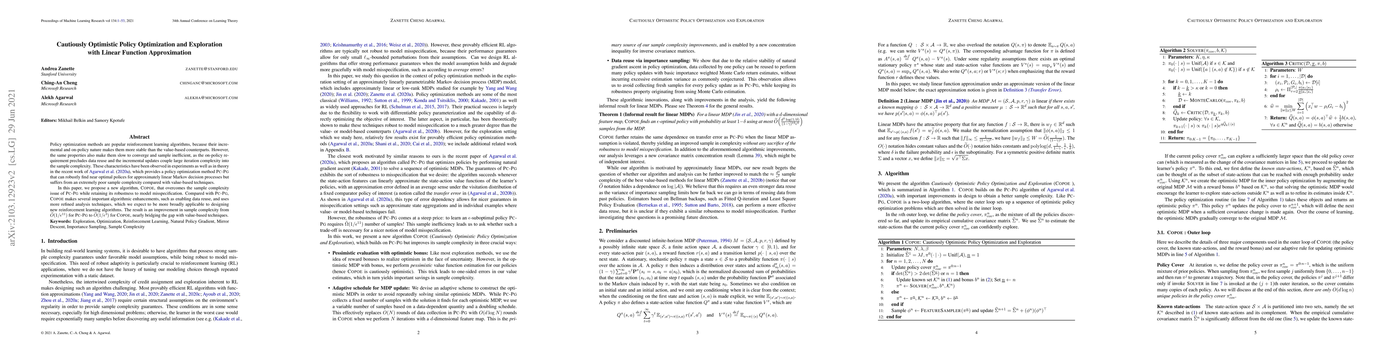 Policy optimization methods are popular reinforcement learning algorithms, because their incremental and on-policy nature makes them more stable than the value-based counterparts. However, the same properties also make them slow to converge and sample inefficient, as the on-policy requirement precludes data reuse and the incremental updates couple large iteration complexity into the sample complexity. These characteristics have been observed in experiments as well as in theory in the recent work of~\citet{agarwal2020pc}, which provides a policy optimization method PCPG that can robustly find near optimal polices for approximately linear Markov decision processes but suffers from an extremely poor sample complexity compared with value-based techniques. In this paper, we propose a new algorithm, COPOE, that overcomes the sample complexity issue of PCPG while retaining its robustness to model misspecification. Compared with PCPG, COPOE makes several important algorithmic enhancements, such as enabling data reuse, and uses more refined analysis techniques, which we expect to be more broadly applicable to designing new reinforcement learning algorithms. The result is an improvement in sample complexity from $\widetilde{O}(1/\epsilon^{11})$ for PCPG to $\widetilde{O}(1/\epsilon^3)$ for PCPG, nearly bridging the gap with value-based techniques.