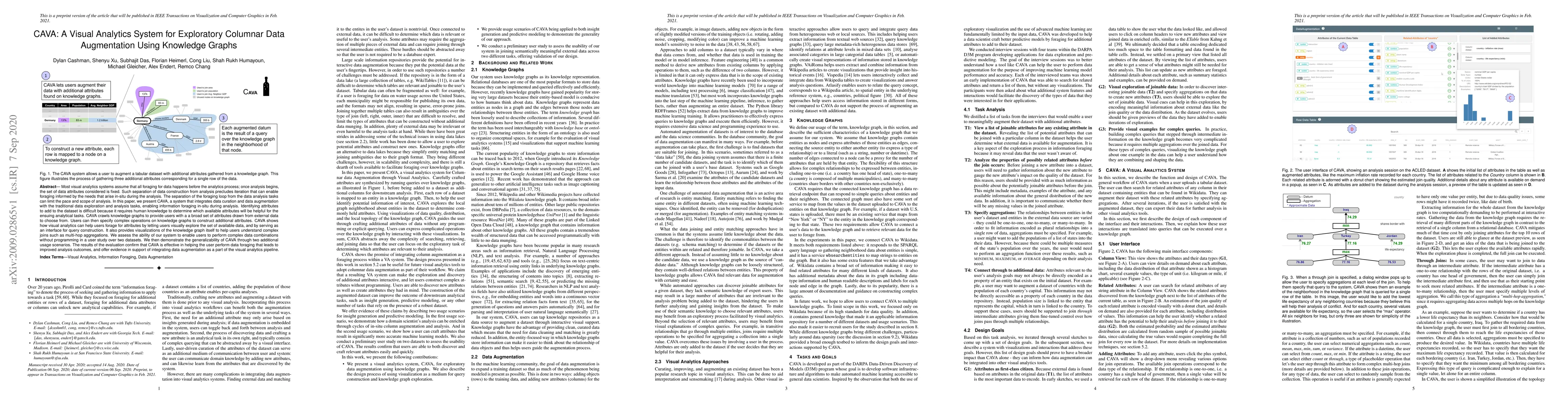 CAVA is a visual analytics system that integrates data curation and augmentation with traditional data exploration and analysis tasks, enabling in-situ information foraging. It uses knowledge graphs to crawl for related attributes and allows users to construct complex operations to create additional attributes.