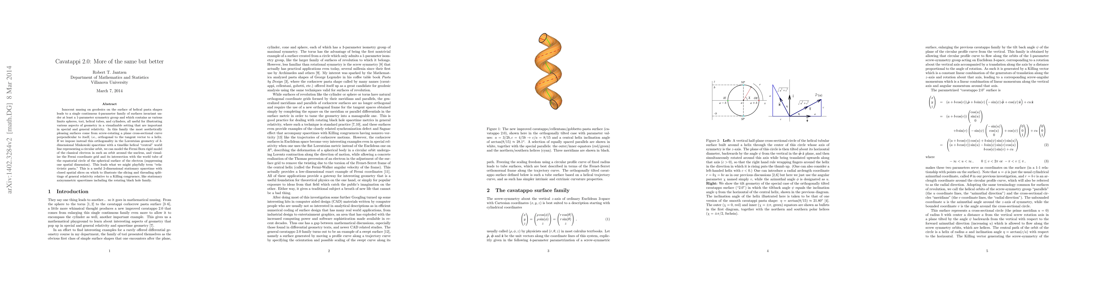 Innocent musing on geodesics on the surface of helical pasta shapes leads to a single continuous 4-parameter family of surfaces invariant under at least a 1-parameter symmetry group and which contains as various limits spheres, tori, helical tubes, and cylinders, all useful for illustrating various aspects of geometry in a visualizable setting that are important in special and general relativity. In this family the most aesthetically pleasing surfaces come from screw-rotating a plane cross-sectional curve perpendicular to itself, i.e., orthogonal to the tangent vector to a helix. If we impose instead this orthogonality in the Lorentzian geometry of 3-dimensional Minkowski spacetime with a timelike helical "central" world line representing a circular orbit, we can model the Fermi Born rigid model of the classical electron in such an orbit around the nucleus, and visualize the Fermi coordinate grid and its intersection with the world tube of the equatorial circle of the spherical surface of the electron (suppressing one spatial dimension). This leads what we might playfully term "relativistic pasta". This is a useful 2-dimensional stationary spacetime with closed spatial slices on which to illustrate the slicing and threading splittings of general relativity relative to a Killing congruence, like stationary axisymmetric spacetimes including the rotating black hole family.