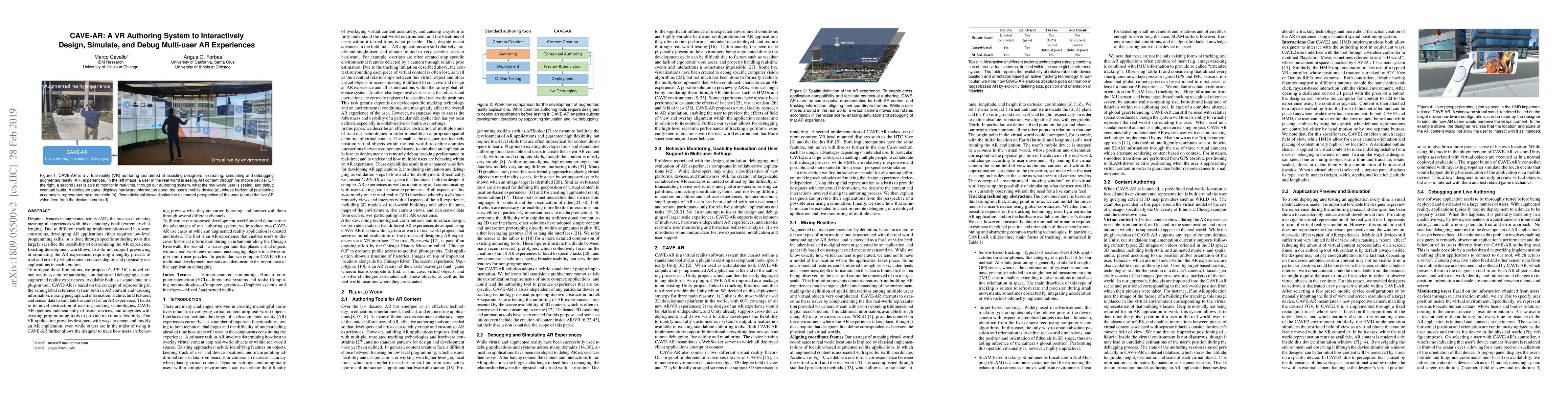 CAVE-AR is a VR authoring system designed to simplify the creation, simulation, and debugging of multi-user AR experiences by integrating geographical and sensor data. It offers a flexible, device-independent workflow for AR development, enabling real-time modifications and user interaction during application use.