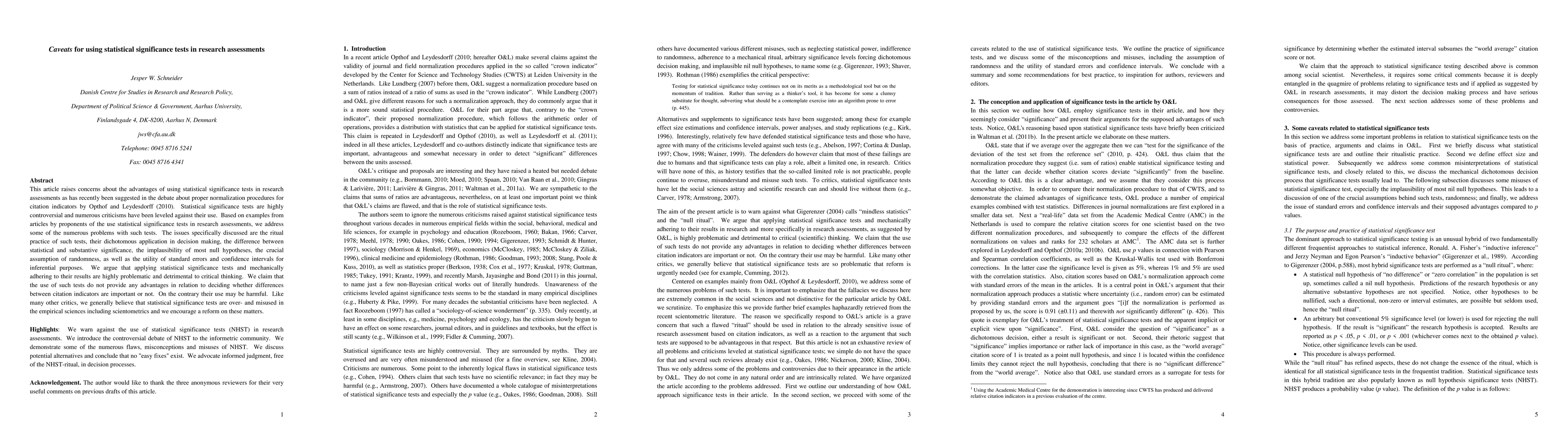 This paper critiques the use of statistical significance tests in research assessments, highlighting issues such as ritualistic application, dichotomous decision-making, and the distinction between statistical and substantive significance. The authors argue that these tests are often misused and can be harmful, advocating for reform in their application within social sciences and scientometrics.