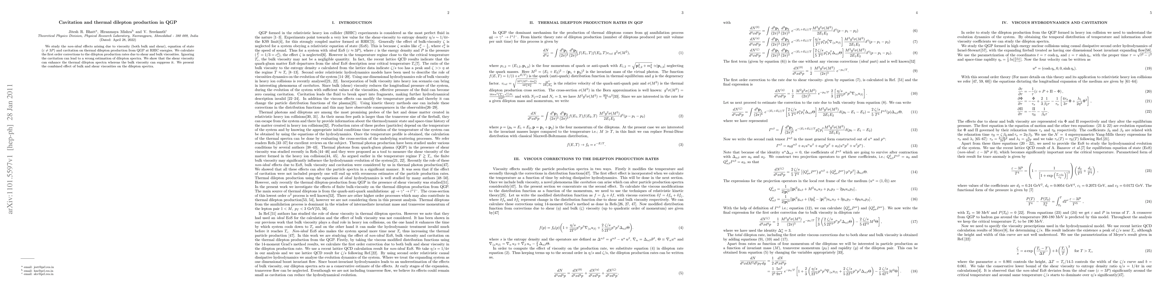 We study the \textit{non-ideal} effects arising due to viscosity (both bulk and shear), equation of state ($\epsilon\neq 3P$) and cavitation on thermal dilepton production from QGP at RHIC energies. We calculate the first order corrections to the dilepton production rates due to shear and bulk viscosities. Ignoring the cavitation can lead to a wrong estimation of dilepton spectra. We show that the shear viscosity can enhance the thermal dilepton spectra whereas the bulk viscosity can suppress it. We present the combined effect of bulk and shear viscosities on the dilepton spectra.