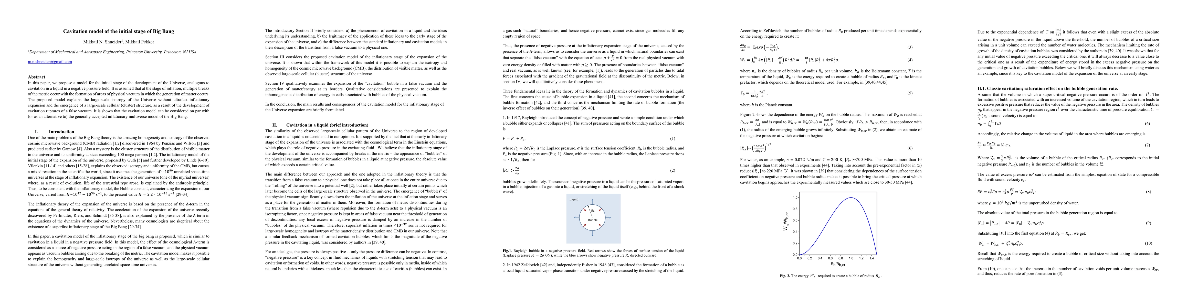 In this paper, we propose a model for the initial stage of the development of the Universe, analogous to cavitation in a liquid in a negative pressure field. It is assumed that at the stage of inflation, multiple breaks of the metric occur with the formation of areas of physical vacuum in which the generation of matter occurs. The proposed model explains the large-scale isotropy of the Universe without ultrafast inflationary expansion and the emergence of a large-scale cellular (cluster) structure, as a result of the development of cavitation ruptures of a false vacuum. It is shown that the cavitation model can be considered on par with (or as an alternative to) the generally accepted inflationary multiverse model of the Big Bang.
