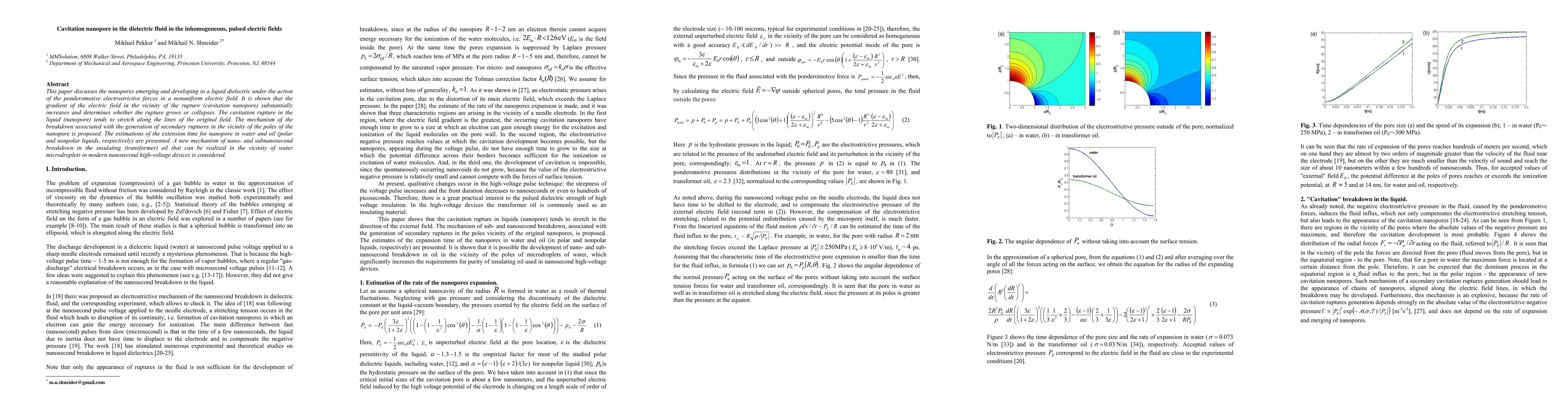 This paper explores the formation and growth of cavitation nanopores in dielectric liquids under pulsed electric fields, revealing that field gradient influences rupture dynamics and proposing a mechanism for secondary ruptures near nanopore poles. It also estimates the extension time for nanopores in water and oil, and introduces a new breakdown mechanism in transformer oil near water microdroplets.