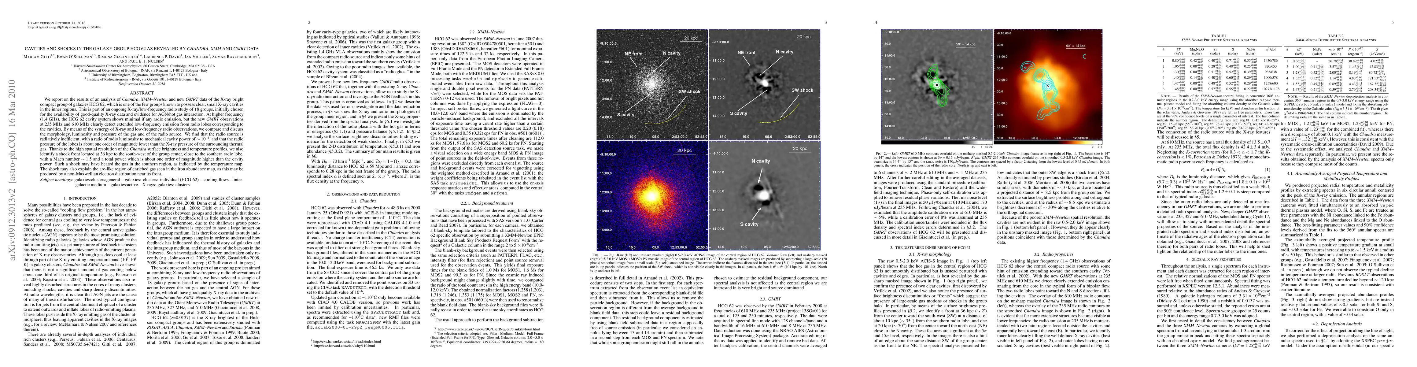 We report on the results of an analysis of Chandra, XMM-Newton and new GMRT data of the X-ray bright compact group of galaxies HCG 62, which is one of the few groups known to possess clear, small X-ray cavities in the inner regions. This is part of an ongoing X-ray/low-frequency radio study of 18 groups, initially chosen for the availability of good-quality X-ray data and evidence for AGN/hot gas interaction. At higher frequency (1.4 GHz), the HCG 62 cavity system shows minimal if any radio emission, but the new GMRT observations at 235 MHz and 610 MHz clearly detect extended low-frequency emission from radio lobes corresponding to the cavities. By means of the synergy of X-ray and low-frequency radio observations, we compare and discuss the morphology, luminosity and pressure of the gas and of the radio source. We find that the radio source is radiatively inefficient, with a ratio of radio luminosity to mechanical cavity power of $\sim 10^{-4}$, and that the radio pressure of the lobes is about one order of magnitude lower than the X-ray pressure of the surrounding thermal gas. Thanks to the high spatial resolution of the Chandra surface brightness and temperature profiles, we also identify a shock front located at 36 kpc to the south-west of the group center, close to the southern radio lobe, with a Mach number $\sim 1.5$ and a total power which is about one order of magnitude higher than the cavity power. Such a shock may have heated the gas in the southern region, as indicated by the temperature map. The shock may also explain the arc-like region of enriched gas seen in the iron abundance map, as this may be produced by a non-Maxwellian electron distribution near its front.