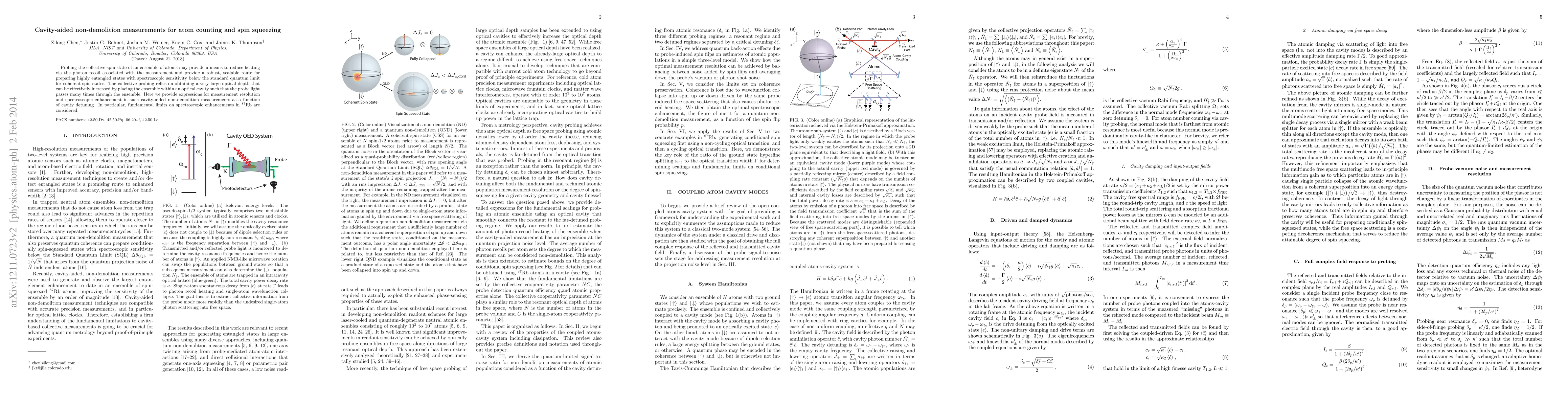 This paper explores cavity-aided non-demolition measurements for atom counting and spin squeezing, aiming to reduce heating from photon recoil and prepare highly entangled states. It provides expressions for measurement resolution and spectroscopic enhancement in optical cavities, focusing on the fundamental limits for $^{87}$Rb.