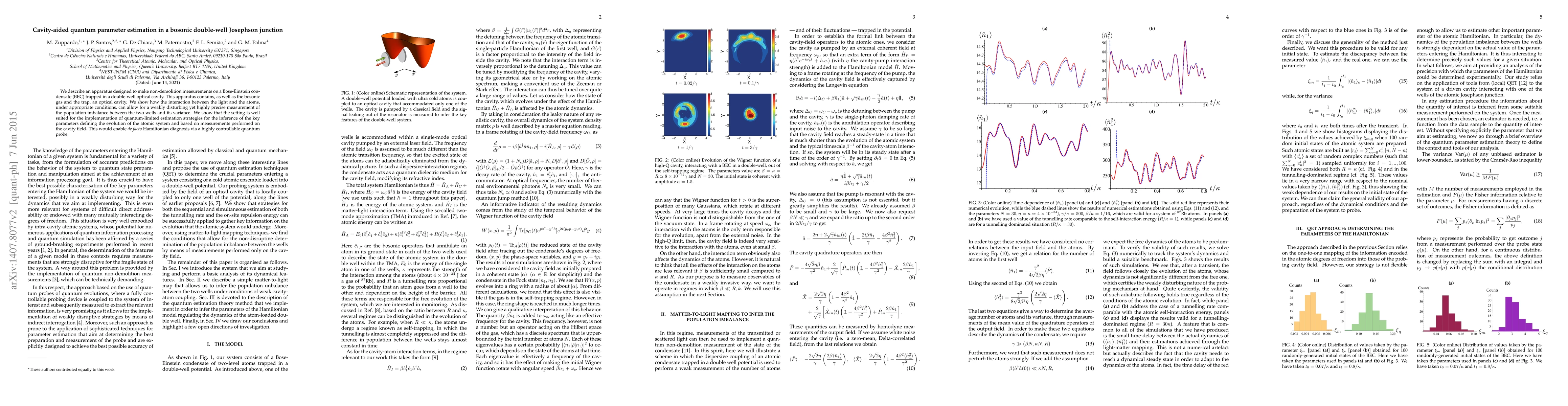 This paper details an apparatus for non-demolition measurements on a Bose-Einstein condensate in a double-well optical cavity, demonstrating precise quantum parameter estimation through light-atom interactions. The setup enables quantum-limited inference of the system's Hamiltonian parameters via cavity field measurements.