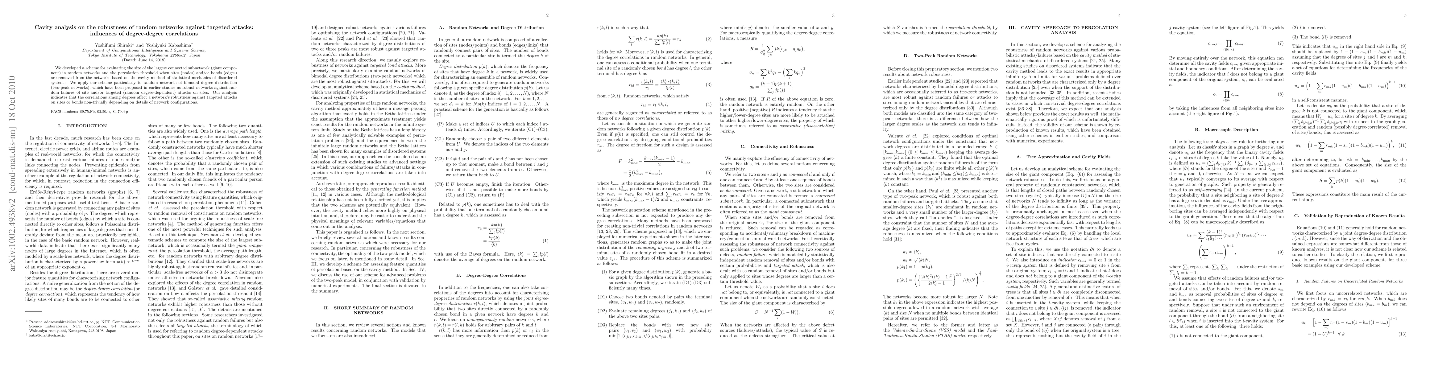 This paper develops a method using the cavity approach to analyze the robustness of random networks against targeted attacks, focusing on the influence of degree-degree correlations. It demonstrates that degree correlations significantly affect network resilience, particularly in bimodal degree distribution networks, challenging the notion of their inherent robustness.