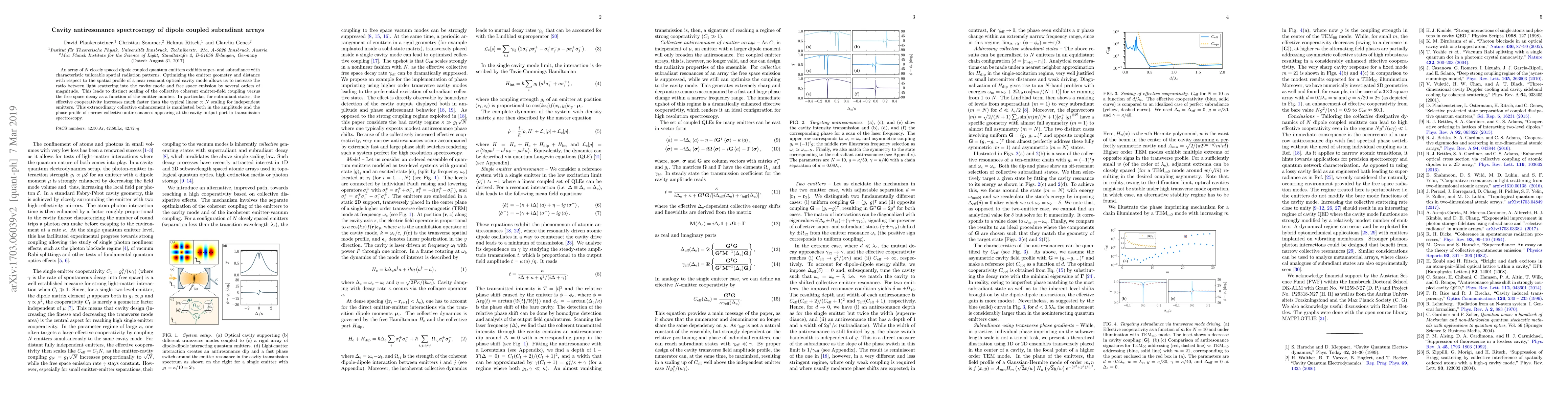 This paper explores cavity antiresonance spectroscopy of dipole-coupled subradiant arrays, demonstrating how optimizing the geometry and distance of quantum emitters relative to a resonant optical cavity mode can significantly enhance light-matter interactions. This results in a nonlinear increase in collective cooperativity for subradiant states, observable through sharp antiresonances in transmission spectroscopy.
