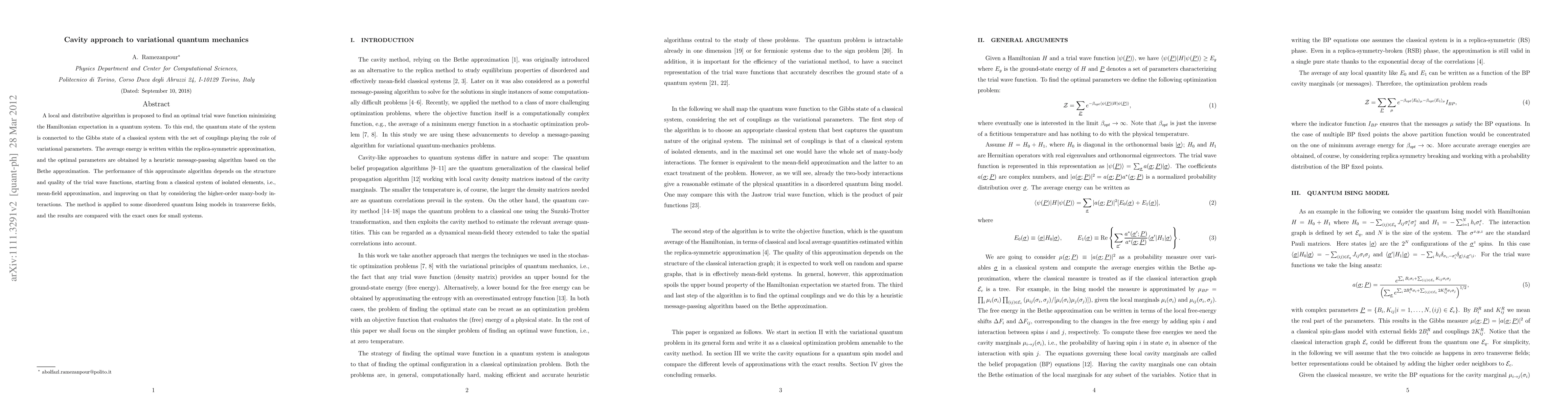 A local and distributive algorithm is proposed to find an optimal trial wave-function minimizing the Hamiltonian expectation in a quantum system. To this end, the quantum state of the system is connected to the Gibbs state of a classical system with the set of couplings playing the role of variational parameters. The average energy is written within the replica-symmetric approximation and the optimal parameters are obtained by a heuristic message passing algorithm based on the Bethe approximation. The performance of this approximate algorithm depends on the structure and quality of the trial wave-functions; starting from a classical system of isolated elements, i.e. mean-field approximation, and improving on that by considering the higher order many-body interactions. The method is applied to some disordered quantum Ising models in transverse fields and the results are compared with the exact ones for small systems.