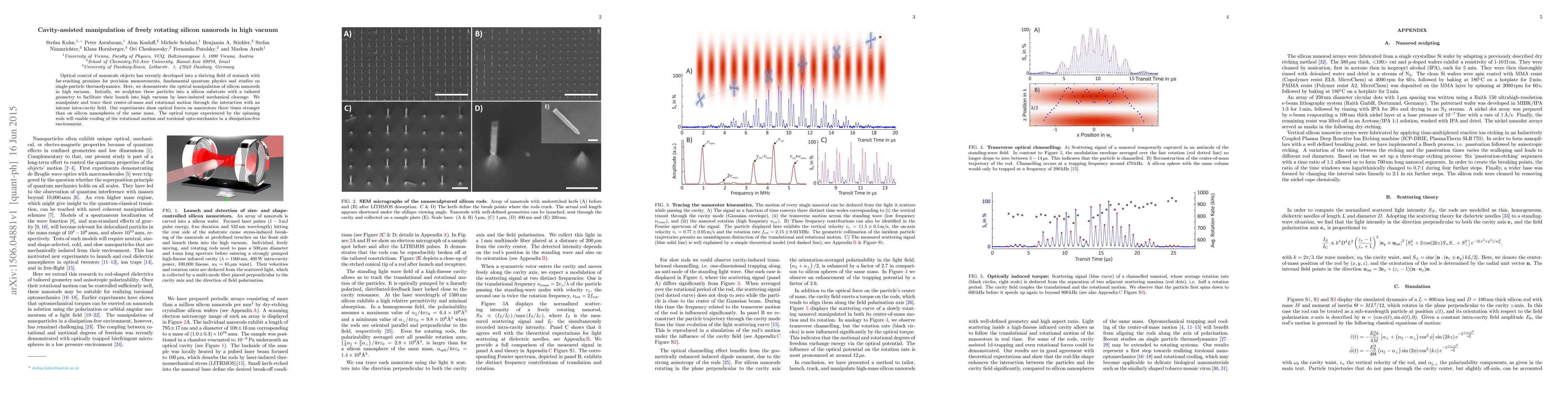 Optical control of nanoscale objects has recently developed into a thriving field of research with far-reaching promises for precision measurements, fundamental quantum physics and studies on single-particle thermodynamics. Here, we demonstrate the optical manipulation of silicon nanorods in high vacuum. Initially, we sculpture these particles into a silicon substrate with a tailored geometry to facilitate their launch into high vacuum by laser-induced mechanical cleavage. We manipulate and trace their center-of-mass and rotational motion through the interaction with an intense intra-cavity field. Our experiments show optical forces on nanorotors three times stronger than on silicon nanospheres of the same mass. The optical torque experienced by the spinning rods will enable cooling of the rotational motion and torsional opto-mechanics in a dissipation-free environment.