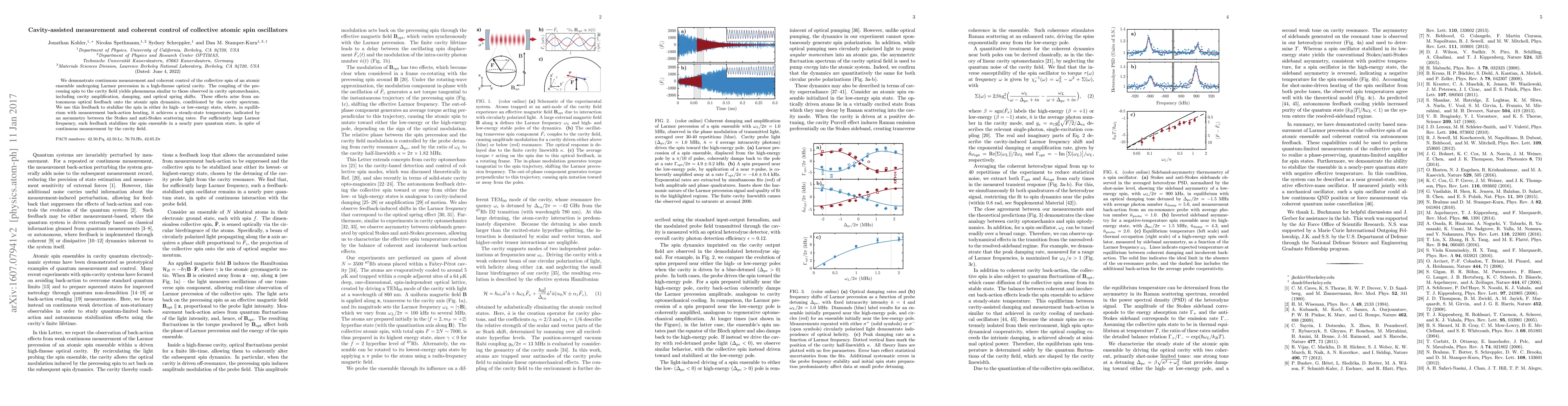 This paper demonstrates the continuous measurement and coherent control of collective atomic spin in a high-finesse optical cavity, achieving stabilization of the spin in either its high- or low-energy state through optical feedback. The study reveals phenomena akin to cavity optomechanics and shows the stabilization of the spin ensemble in a nearly pure quantum state despite continuous measurement.