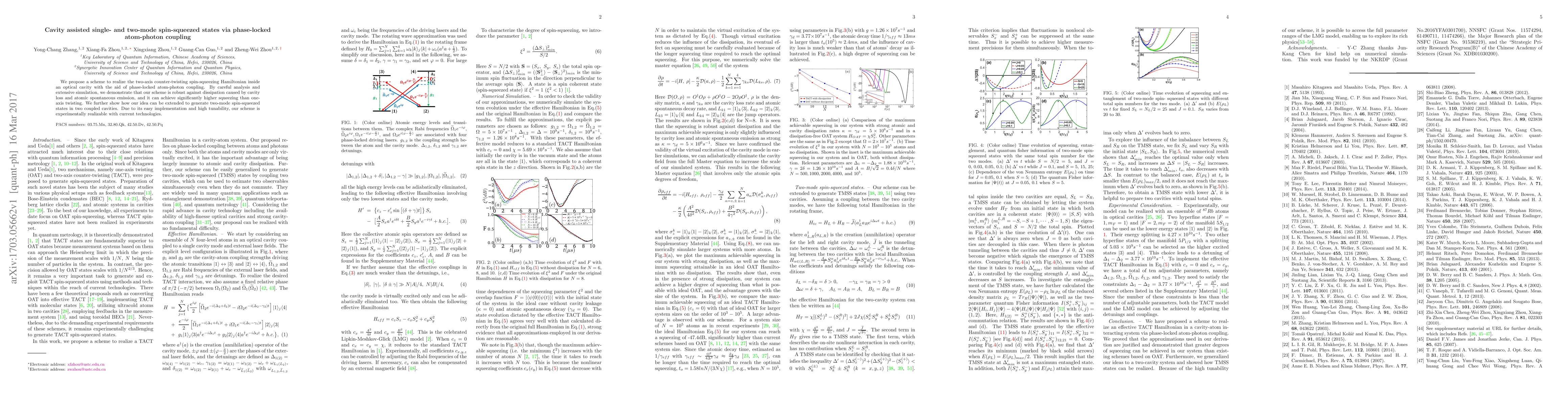 The paper proposes a method for generating single- and two-mode spin-squeezed states using a two-axis counter-twisting Hamiltonian inside an optical cavity with phase-locked atom-photon coupling. The scheme is shown to be robust against common dissipative effects and can achieve higher squeezing compared to one-axis twisting, with potential for experimental realization using current technology.