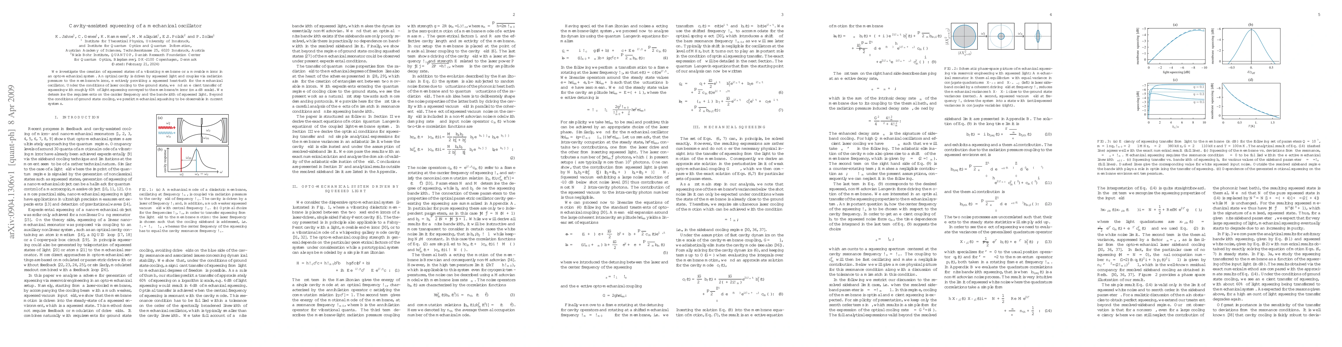 The paper presents a detailed theoretical framework for cavity-assisted squeezing of mechanical oscillators, including the derivation of effective equations of motion and analysis of squeezing transfer under various conditions.