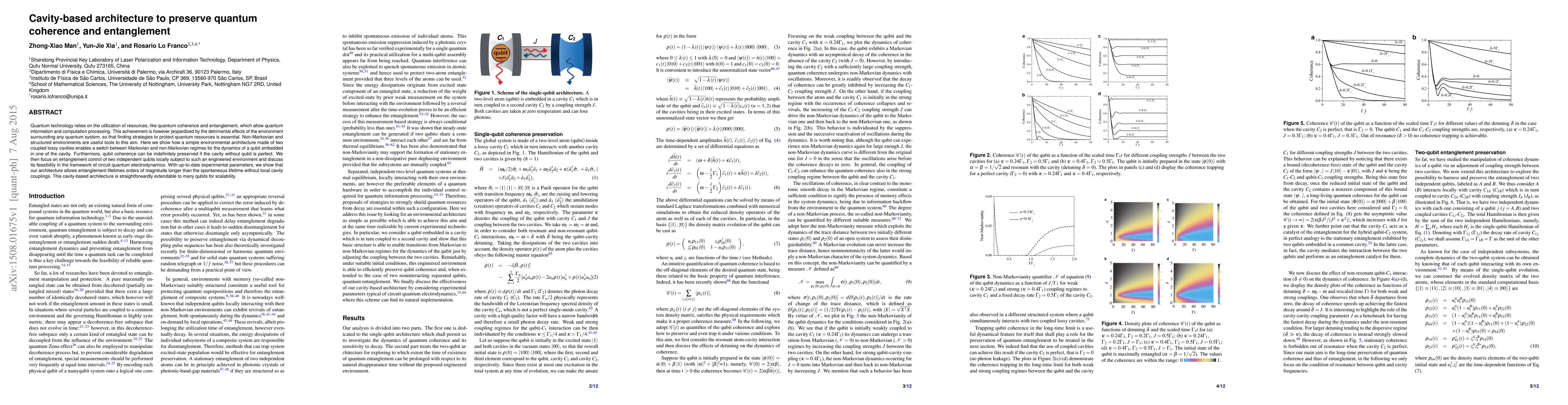 This paper proposes a cavity-based architecture to preserve quantum coherence and entanglement by switching between Markovian and non-Markovian regimes. The architecture, consisting of two coupled lossy cavities, can indefinitely preserve qubit coherence and significantly extend entanglement lifetimes, demonstrating scalability for multiple qubits.