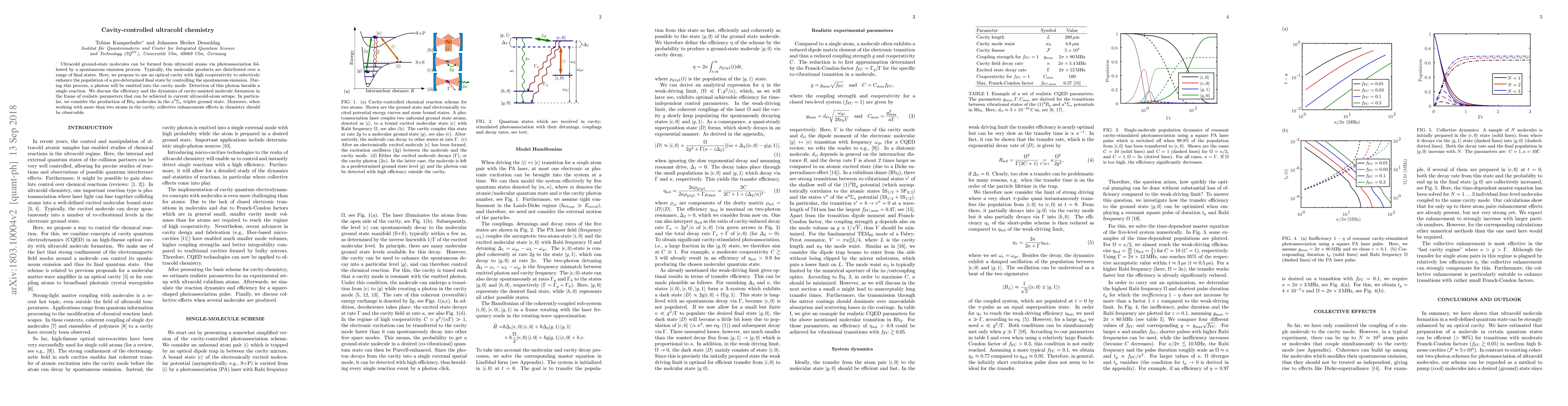 Ultracold ground-state molecules can be formed from ultracold atoms via photoassociation followed by a spontaneous emission process. Typically, the molecular products are distributed over a range of final states. Here, we propose to use an optical cavity with high cooperativity to selectively enhance the population of a pre-determined final state by controlling the spontaneous emission. During this process, a photon will be emitted into the cavity mode. Detection of this photon heralds a single reaction. We discuss the efficiency and the dynamics of cavity-assisted molecule formation in the frame of realistic parameters that can be achieved in current ultracold-atom setups. In particular, we consider the production of Rb$_2$ molecules in the $a^3\Sigma_u$ triplet ground state. Moreover, when working with more than two atoms in the cavity, collective enhancement effects in chemistry should be observable.