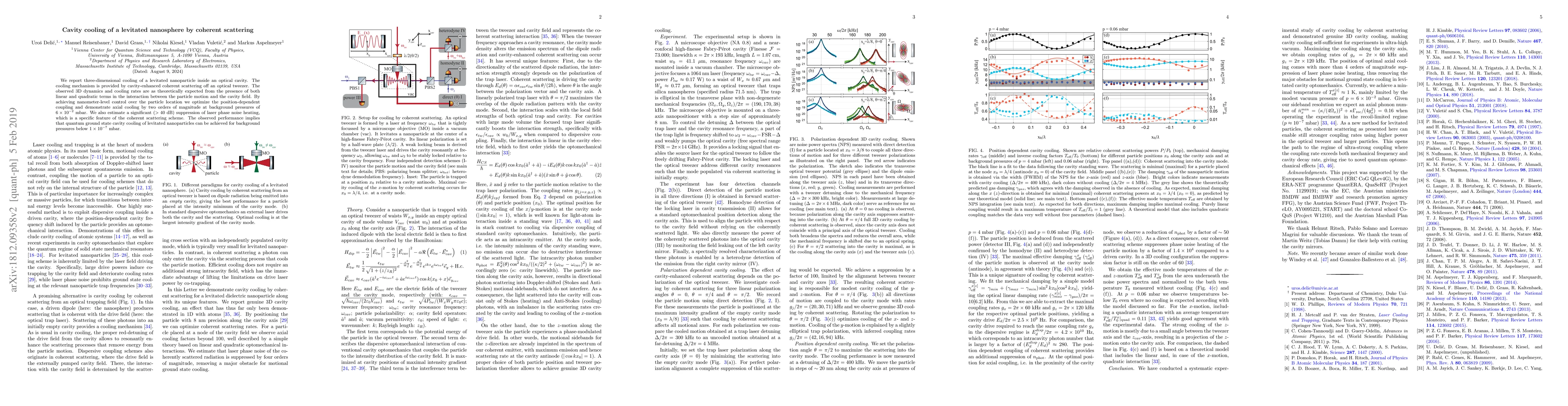 This paper reports on the three-dimensional cooling of a levitated nanoparticle within an optical cavity via coherent scattering, achieving nanometer-level control and a two-order-of-magnitude axial cooling. The study demonstrates significant suppression of laser phase noise and implies potential for quantum ground state cooling at ultra-low pressures.