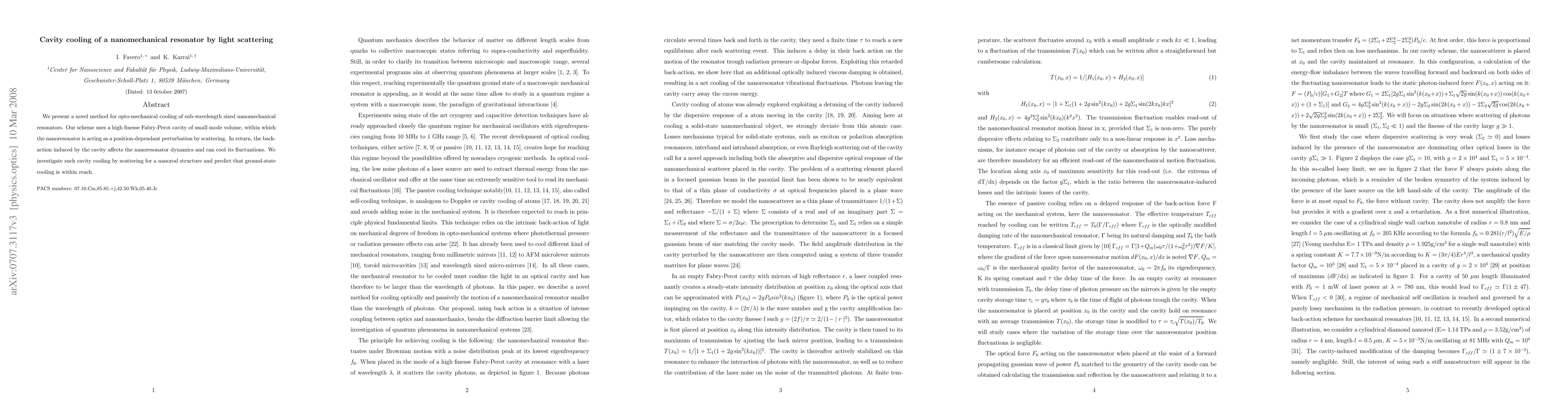 This paper introduces a method for cooling nanomechanical resonators using a high finesse Fabry-Perot cavity, where the resonator scatters light, leading to back-action cooling. The study predicts that this approach can achieve ground-state cooling for a nanorod structure.