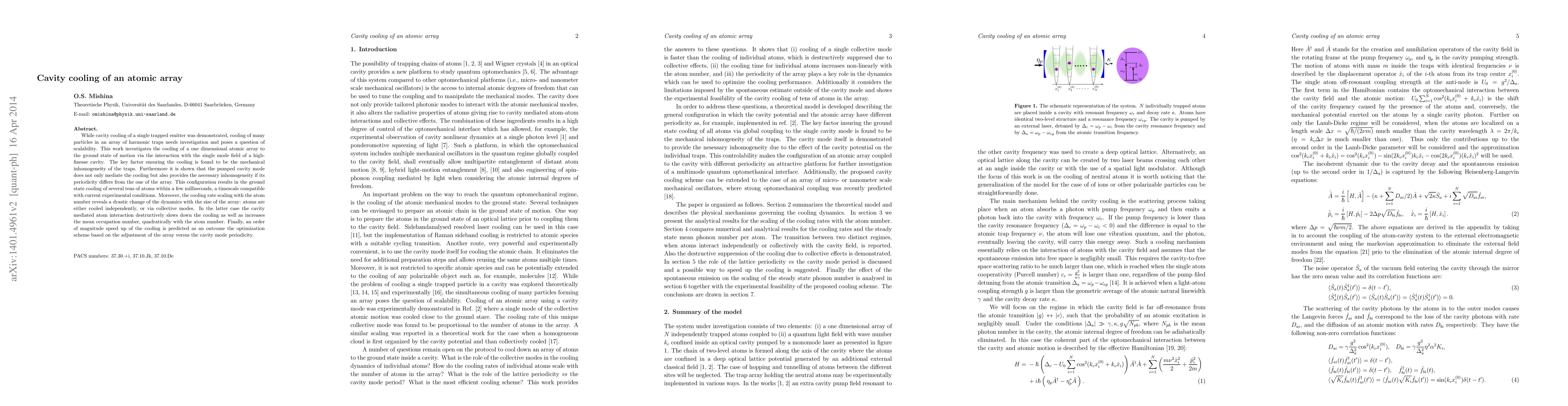 This paper investigates the cooling of a one-dimensional atomic array to its ground state via interaction with a high-finesse cavity, finding that mechanical inhomogeneity in the traps is key. The cavity mode mediates cooling and provides necessary inhomogeneity if its periodicity differs from the array, leading to a scalable cooling process.