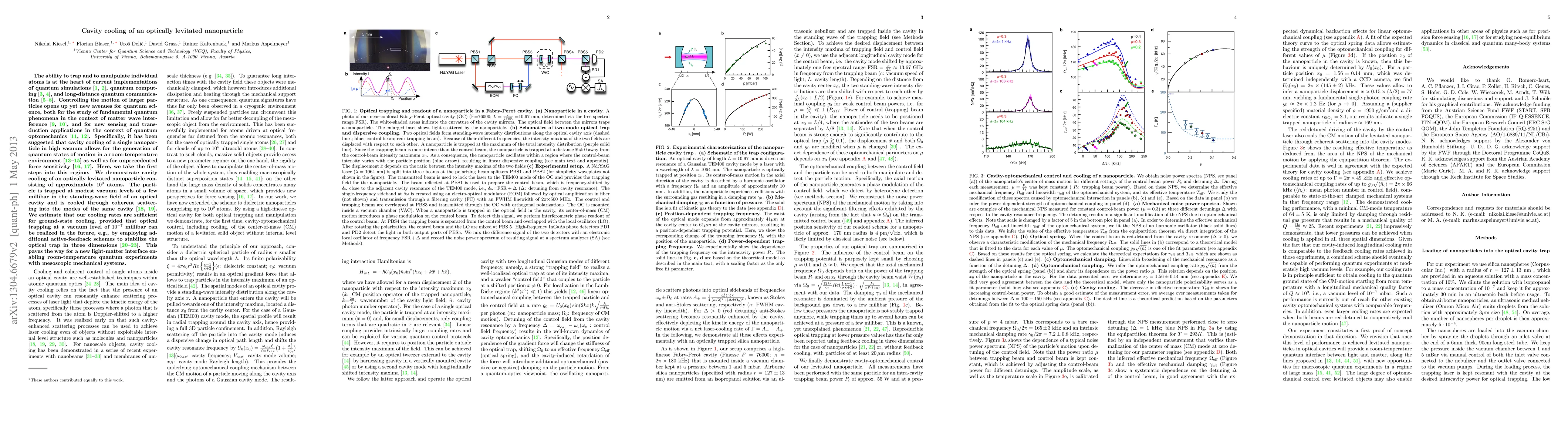 This research demonstrates cavity cooling of an optically levitated nanoparticle, achieving significant control over its motion, which could enable room-temperature quantum experiments and improve force sensitivity in quantum optomechanics. Future advancements in vacuum levels may allow for ground-state cooling.