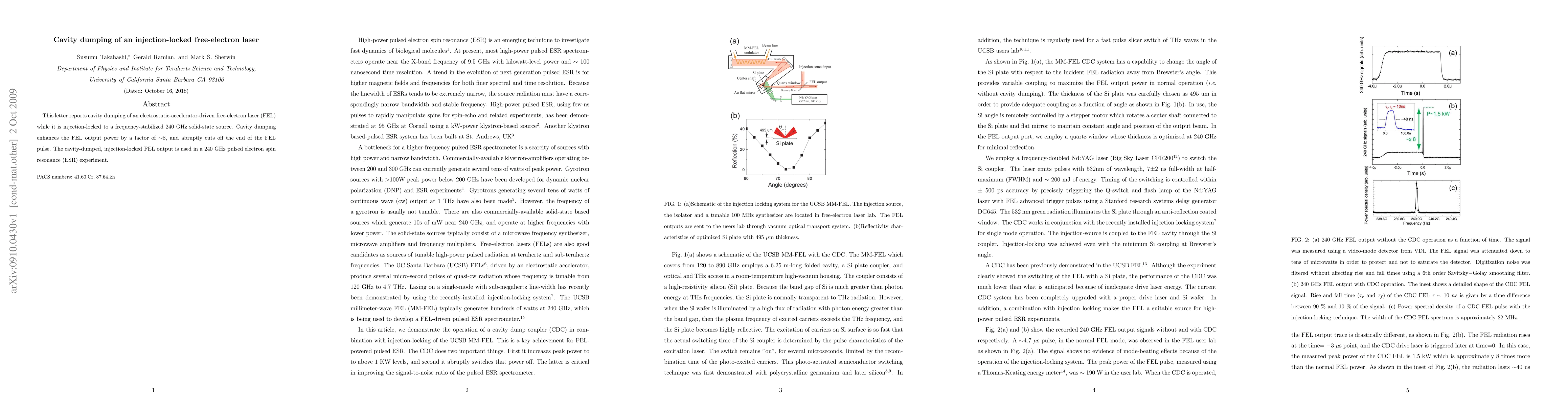 This paper describes the successful cavity dumping of an injection-locked free-electron laser, which enhances its output power by approximately eight times and sharply terminates the FEL pulse, enabling its application in a 240 GHz pulsed electron spin resonance experiment.