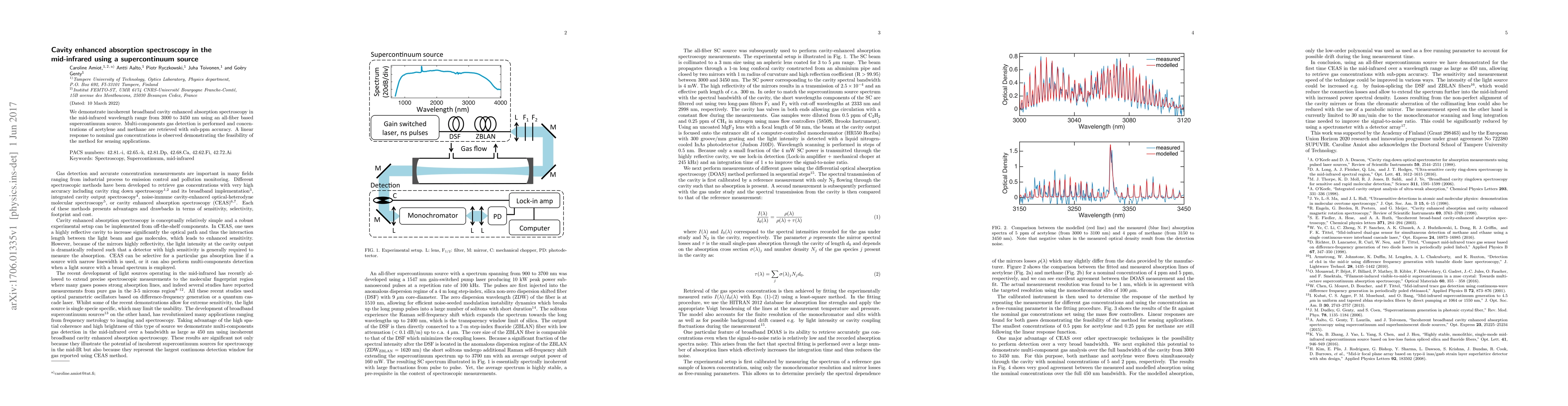We demonstrate incoherent broadband cavity enhanced absorption spectroscopy in the mid-infrared wave- length range from 3000 to 3450 nm using an all-fiber based supercontinuum source. Multi-components gas detection is performed and concentrations of acetylene and methane are retrieved with sub-ppm accuracy. A linear response to nominal gas concentrations is observed demonstrating the feasibility of the method for sensing applications.