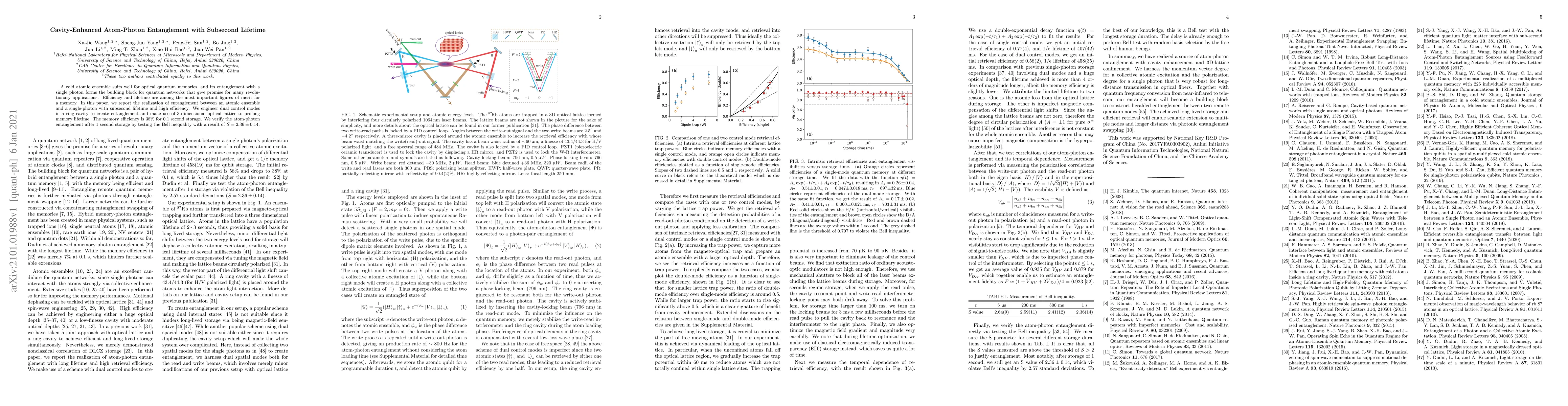 This paper reports the successful creation of entanglement between a cold atomic ensemble and a single photon with subsecond lifetime and high efficiency, utilizing dual control modes in a ring cavity and a 3-dimensional optical lattice to enhance memory efficiency to 38% for 0.1 second storage, and verifying the entanglement after 1 second storage via a Bell inequality test.