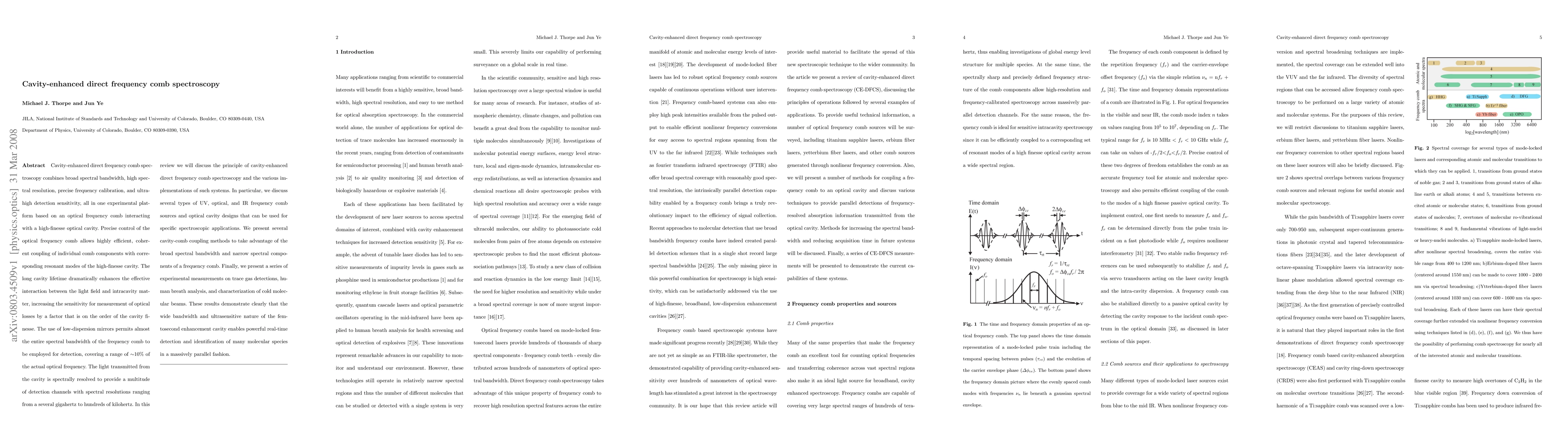 This research paper reviews cavity-enhanced direct frequency comb spectroscopy, highlighting its combination of broad spectral bandwidth, high resolution, and ultrahigh sensitivity through an optical frequency comb interacting with a high-finesse cavity. It discusses various comb sources and cavity designs for specific spectroscopic applications and presents experimental measurements for trace gas detection and molecular beam characterization.