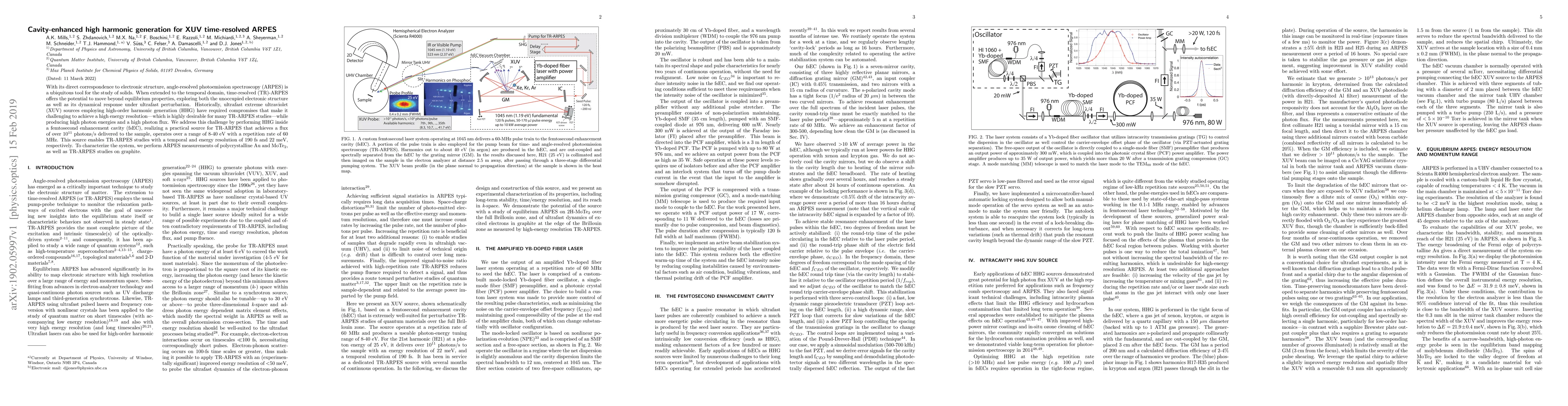 This paper presents a novel high harmonic generation technique within a femtosecond enhancement cavity to create an ultrafast extreme ultraviolet source for time-resolved angle-resolved photoemission spectroscopy (TR-ARPES), achieving high photon flux and resolution, and enabling studies of electronic structure dynamics. The system demonstrates temporal and energy resolutions of 190 fs and 22 meV, respectively, validated through ARPES measurements on Au, MoTe$_2$, and graphite.