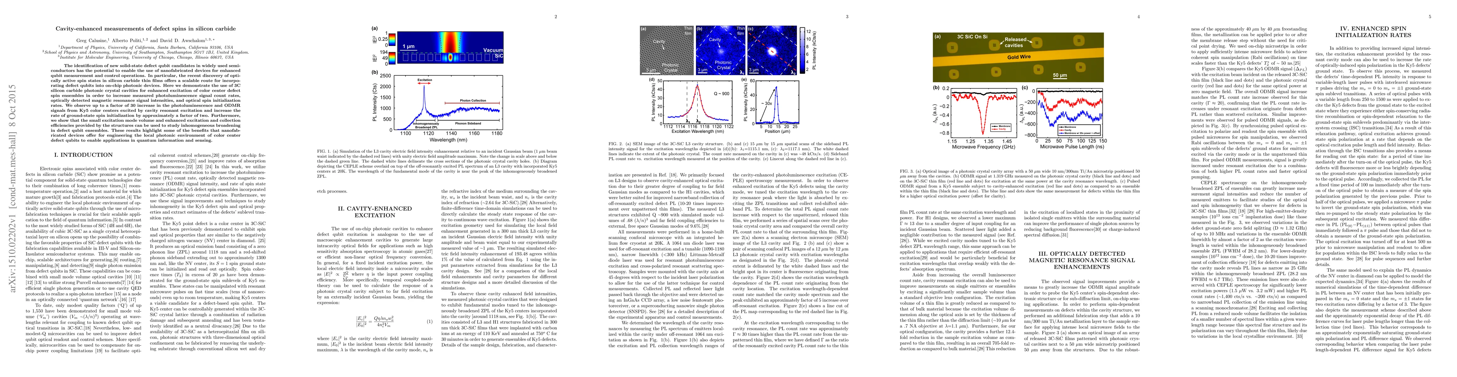 This paper demonstrates enhanced measurements of defect spins in silicon carbide using photonic crystal cavities, achieving up to a 30-fold increase in photoluminescence and optically detected magnetic resonance signals, which could significantly advance quantum information and sensing applications.