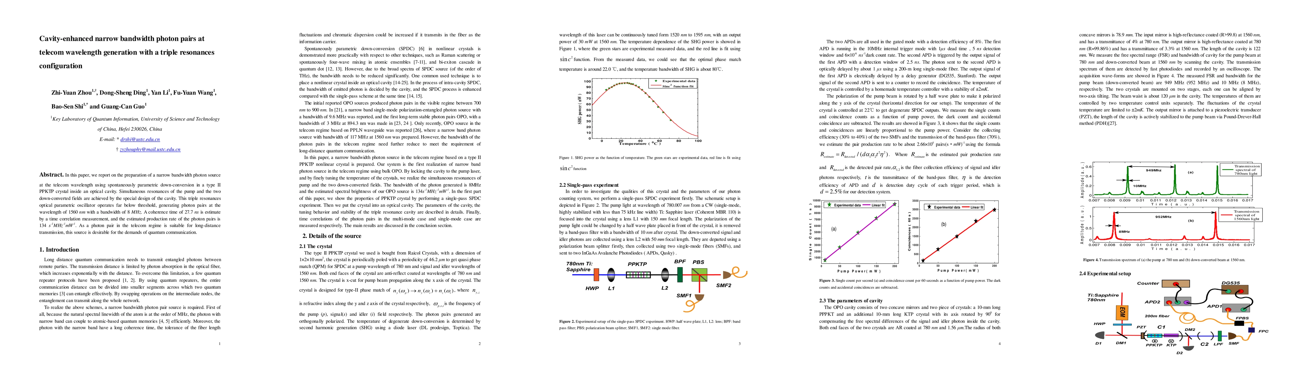 Researchers developed a narrow bandwidth photon pairs source at the telecom wavelength using a type II PPKTP crystal in an optical cavity, achieving a 8 MHz bandwidth and 134 s^-1MHz^-1mW^-1 generation rate.
