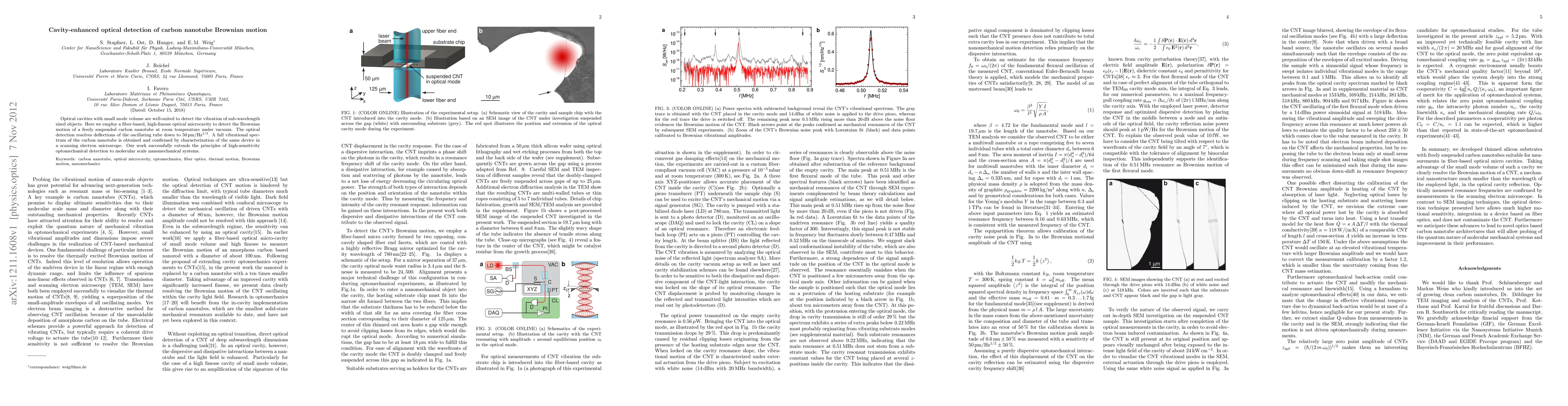 Optical cavities with small mode volume are well-suited to detect the vibration of sub-wavelength sized objects. Here we employ a fiber-based, high-finesse optical microcavity to detect the Brownian motion of a freely suspended carbon nanotube at room temperature under vacuum. The optical detection resolves deflections of the oscillating tube down to 50pm/Hz^1/2. A full vibrational spectrum of the carbon nanotube is obtained and confirmed by characterization of the same device in a scanning electron microscope. Our work successfully extends the principles of high-sensitivity optomechanical detection to molecular scale nanomechanical systems.