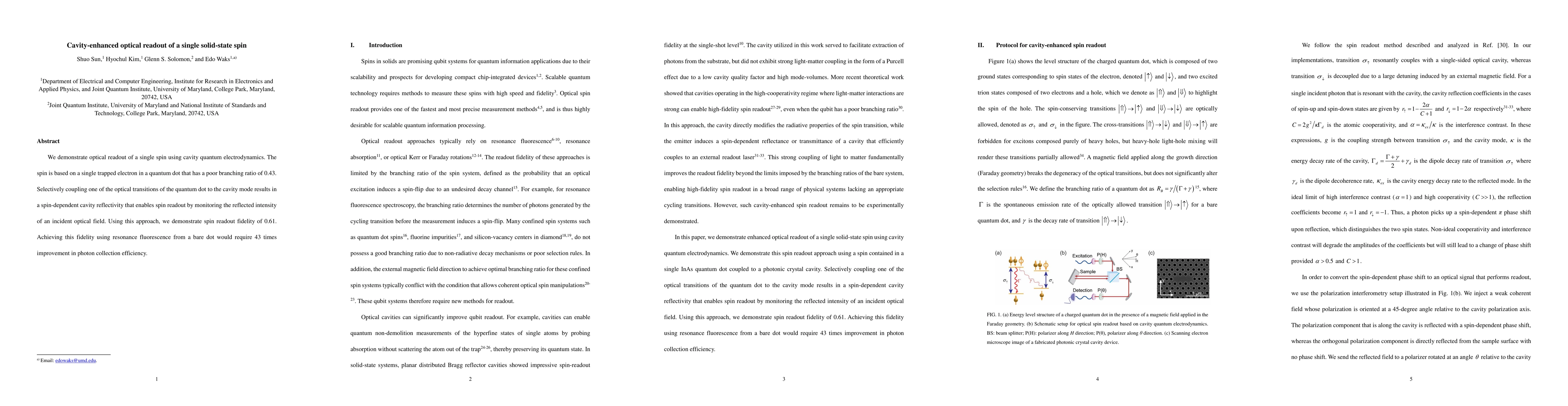 This paper demonstrates optical readout of a single electron spin in a quantum dot through cavity quantum electrodynamics, achieving a spin readout fidelity of 0.61, significantly improving upon conventional methods that would require 43 times better photon collection efficiency.