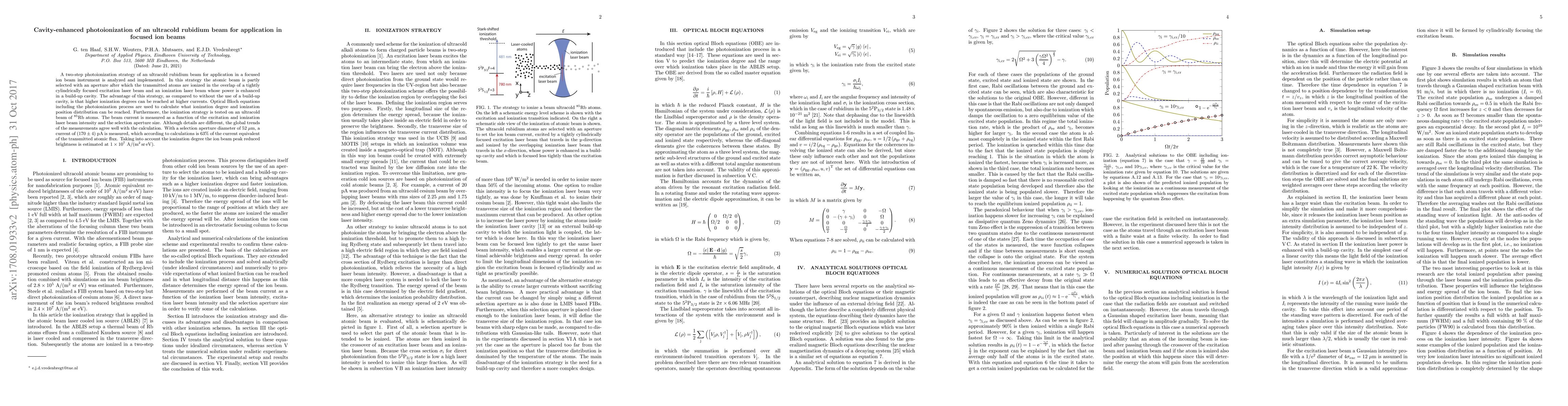 A two-step photoionization strategy of an ultracold rubidium beam for application in a focused ion beam instrument is analyzed and implemented. In this strategy the atomic beam is partly selected with an aperture after which the transmitted atoms are ionized in the overlap of a tightly cylindrically focused excitation laser beam and an ionization laser beam whose power is enhanced in a build-up cavity. The advantage of this strategy, as compared to without the use of a build-up cavity, is that higher ionization degrees can be reached at higher currents. Optical Bloch equations including the photoionization process are used to calculate what ionization degree and ionization position distribution can be reached. Furthermore, the ionization strategy is tested on an ultracold beam of $^{85}$Rb atoms. The beam current is measured as a function of the excitation and ionization laser beam intensity and the selection aperture size. Although details are different, the global trends of the measurements agree well with the calculation. With a selection aperture diameter of 52 $\mu$m, a current of $\left(170\pm4\right)$ pA is measured, which according to calculations is 63% of the current equivalent of the transmitted atomic flux. Taking into account the ionization degree the ion beam peak reduced brightness is estimated at $1\times10^7$ A/(m$^2\,$sr$\,$eV).