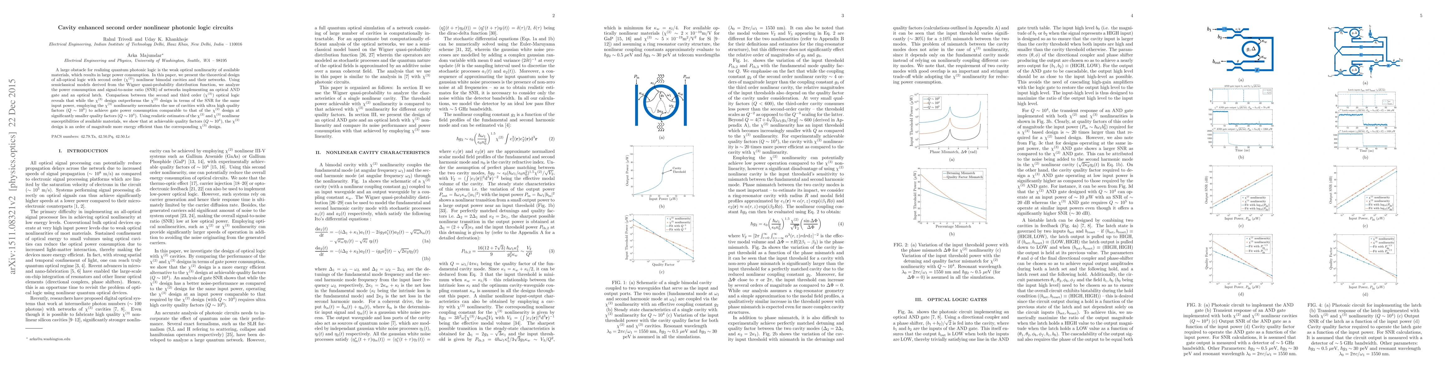 A large obstacle for realizing quantum photonic logic is the weak optical nonlinearity of available materials, which results in large power consumption. In this paper, we present the theoretical design of all-optical logic with second order ($\chi^{(2)}$) nonlinear bimodal cavities and their networks. Using semiclassical models derived from the Wigner quasi-probability distribution function, we analyze the power consumption and signal-to-noise ratio (SNR) of networks implementing an optical AND gate and an optical latch. Comparison between the second and third order $(\chi^{(3)})$ optical logic reveals that while the $\chi^{(3)}$ design outperforms the $\chi^{(2)}$ design in terms of the SNR for the same input power, employing the $\chi^{(3)}$ nonlinearity necessitates the use of cavities with ultra high quality factors ($Q\sim 10^6$) to achieve gate power consumption comparable to that of the $\chi^{(2)}$ design at significantly smaller quality factors ($Q \sim 10^4$). Using realistic estimates of the $\chi^{(2)}$ and $\chi^{(3)}$ nonlinear susceptibilities of available materials, we show that at achievable quality factors ($Q \sim 10^4$), the $\chi^{(2)}$ design is an order of magnitude more energy efficient than the corresponding $\chi^{(3)}$ design.