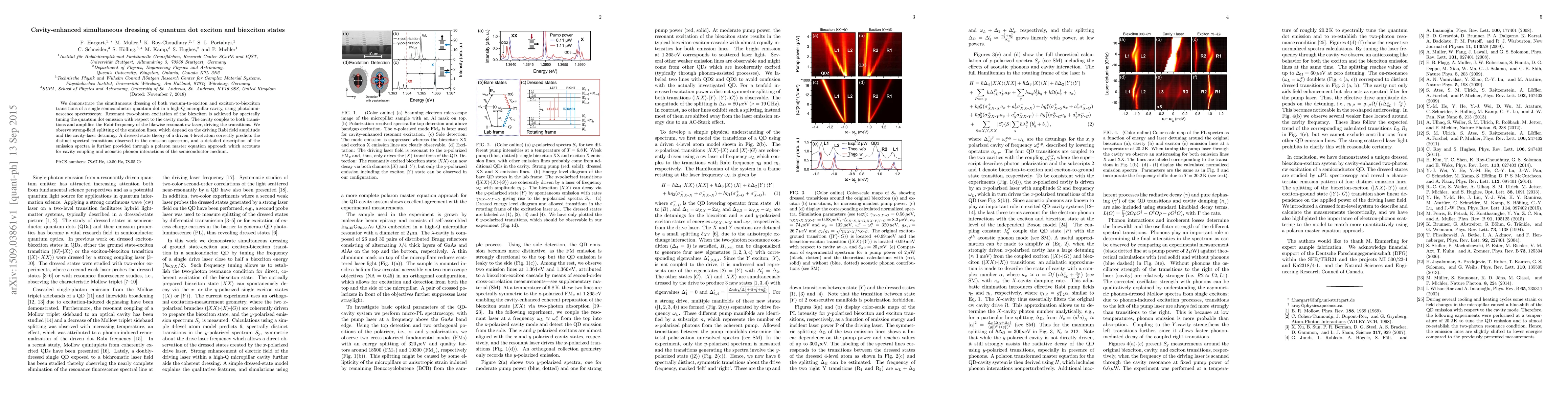 This paper demonstrates the simultaneous dressing of quantum dot exciton and biexciton states via a high-Q micropillar cavity, achieving resonant two-photon excitation through spectral tuning. The cavity amplifies the Rabi-frequency, leading to strong-field splitting in the emission lines, which are accurately predicted by a dressed state theory and a polaron master equation.
